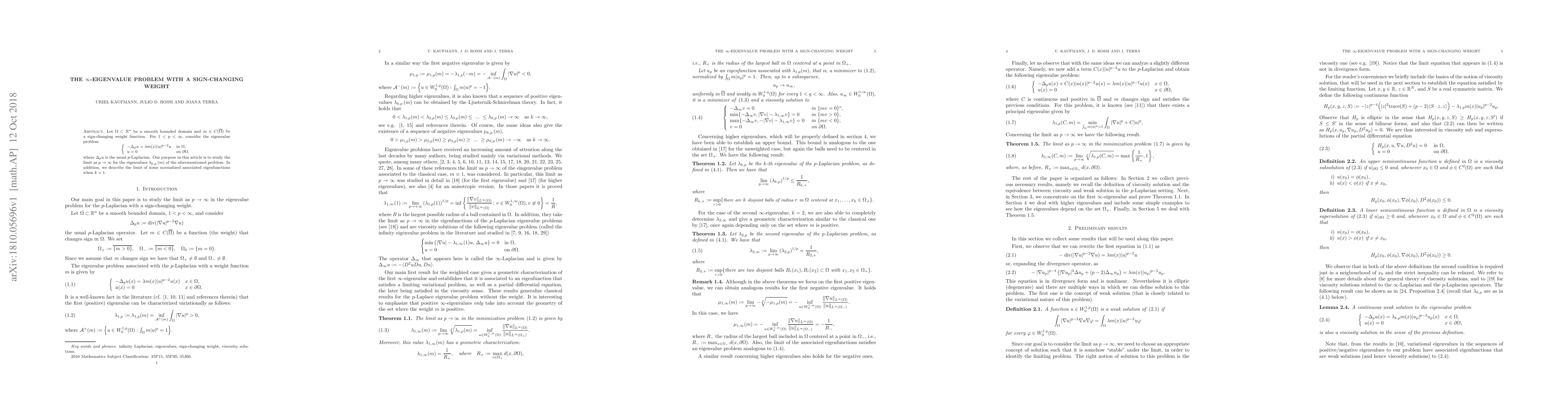 This paper explores the $\infty$-eigenvalue problem for a $p$-Laplacian operator with a sign-changing weight function in a bounded domain. It investigates the limit behavior of eigenvalues as $p$ approaches infinity and describes the convergence of normalized eigenfunctions for the first eigenvalue.