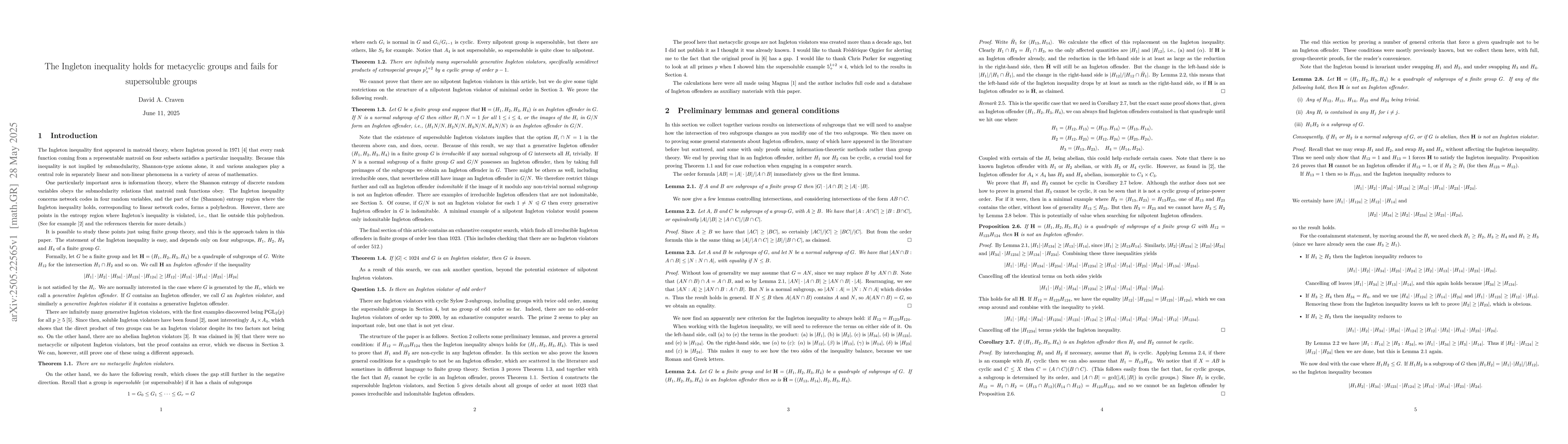 The paper employs group theory and matroid theory, specifically focusing on the Ingleton inequality within finite groups, to prove its validity for metacyclic groups and its failure for supersoluble groups. It also provides a Magma package for verification.