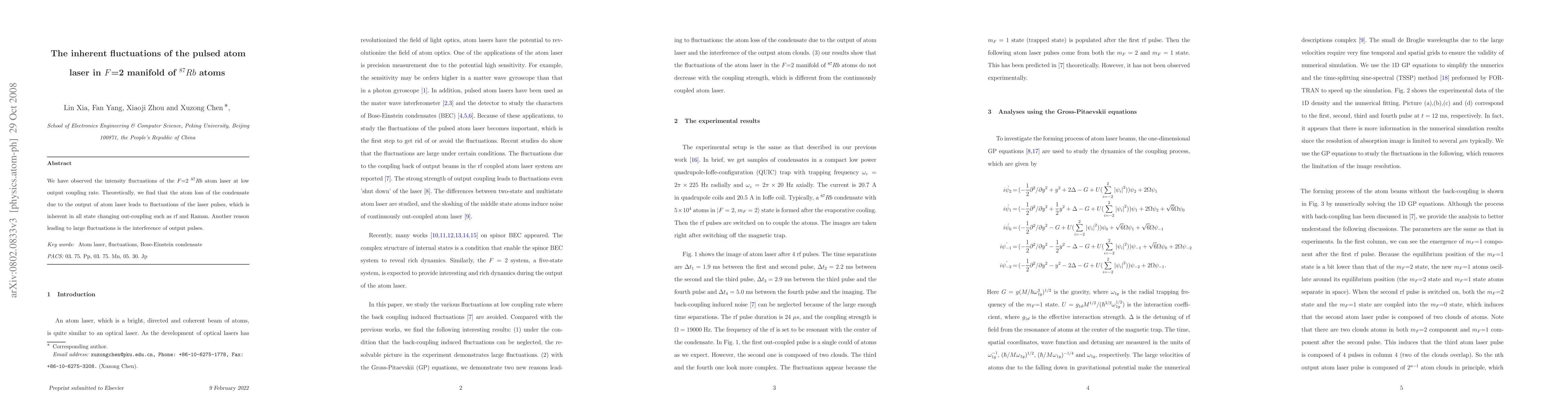 We have observed the intensity fluctuations of the F=2 87Rb atom laser at low output coupling rate. Theoretically, we find that the atom loss of the condensate due to the output of atom laser leads to fluctuations of the laser pulses, which is inherent in all state changing out-coupling such as rf and Raman. Another reason leading to large fluctuations is the interference of output pulses.