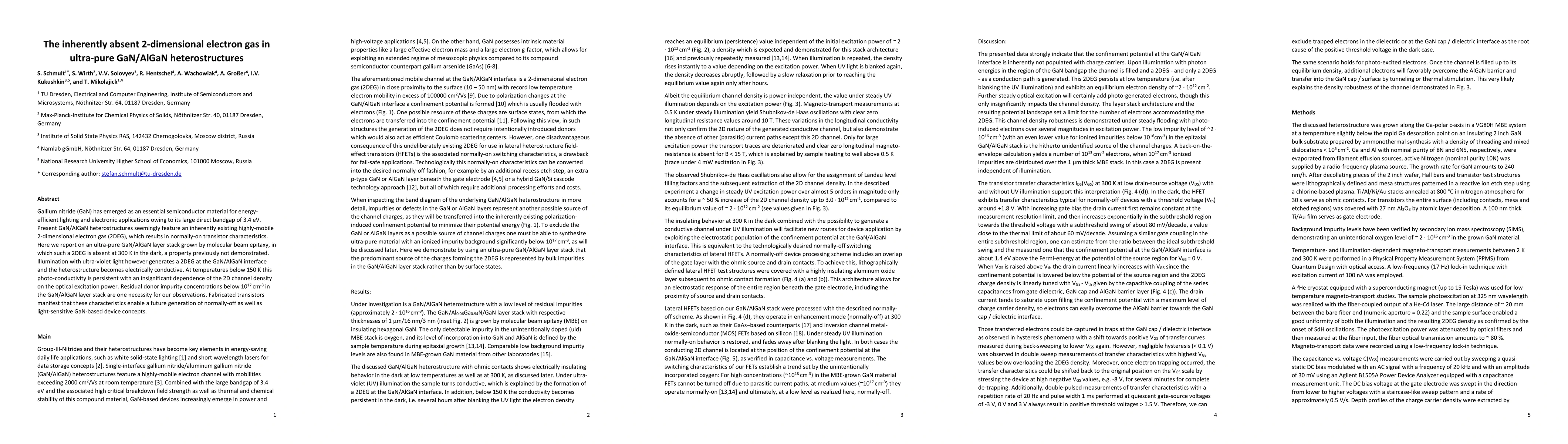 This research demonstrates that ultra-pure GaN/AlGaN heterostructures lack a 2-dimensional electron gas (2DEG) at room temperature in the dark, contrasting typical behavior. Under UV illumination, a 2DEG forms, enabling conductivity that persists below 150 K, paving the way for normally-off and light-sensitive GaN-based devices.