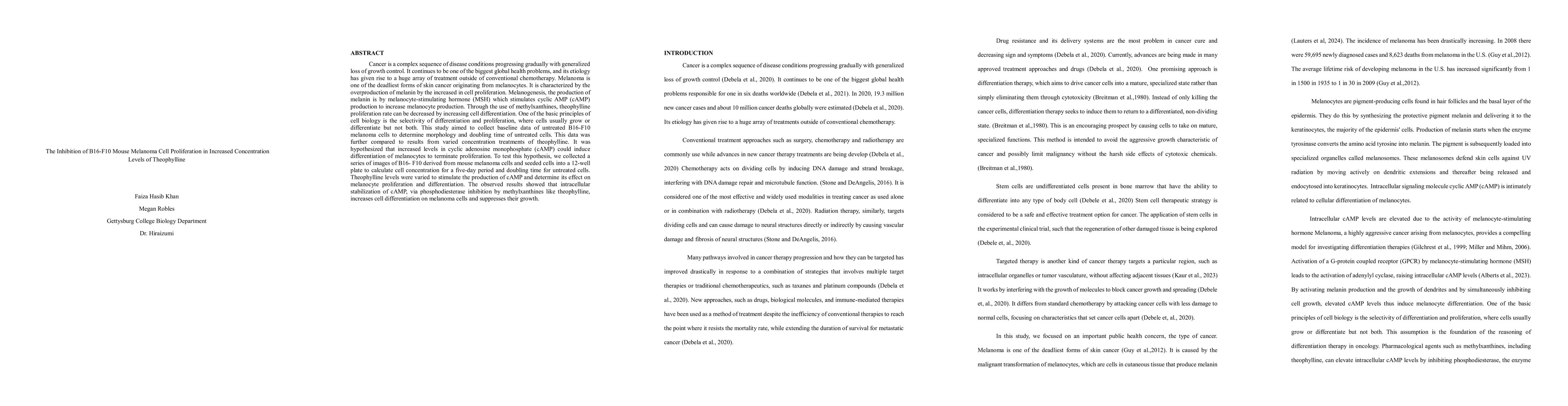 Cancer is a complex sequence of disease conditions progressing gradually with generalized loss of growth control. It continues to be one of the biggest global health problems, and its etiology has given rise to a huge array of treatment outside of conventional chemotherapy. Melanoma is one of the deadliest forms of skin cancer originating from melanocytes. It is characterized by the overproduction of melanin by the increased in cell proliferation. Melanogenesis, the production of melanin is by melanocyte-stimulating hormone (MSH) which stimulates cyclic AMP (cAMP) production to increase melanocyte production. Through the use of methylxanthines, theophylline proliferation rate can be decreased by increasing cell differentiation. One of the basic principles of cell biology is the selectivity of differentiation and proliferation, where cells usually grow or differentiate but not both. This study aimed to collect baseline data of untreated B16-F10 melanoma cells to determine morphology and doubling time of untreated cells. This data was further compared to results from varied concentration treatments of theophylline. It was hypothesized that increased levels in cyclic adenosine monophosphate (cAMP) could induce differentiation of melanocytes to terminate proliferation. To test this hypothesis, we collected a series of images of B16- F10 derived from mouse melanoma cells and seeded cells into a 12-well plate to calculate cell concentration for a five-day period and doubling time for untreated cells. Theophylline levels were varied to stimulate the production of cAMP and determine its effect on melanocyte proliferation and differentiation. The observed results showed that intracellular stabilization of cAMP, via phosphodiesterase inhibition by methylxanthines like theophylline, increases cell differentiation on melanoma cells and suppresses their growth.