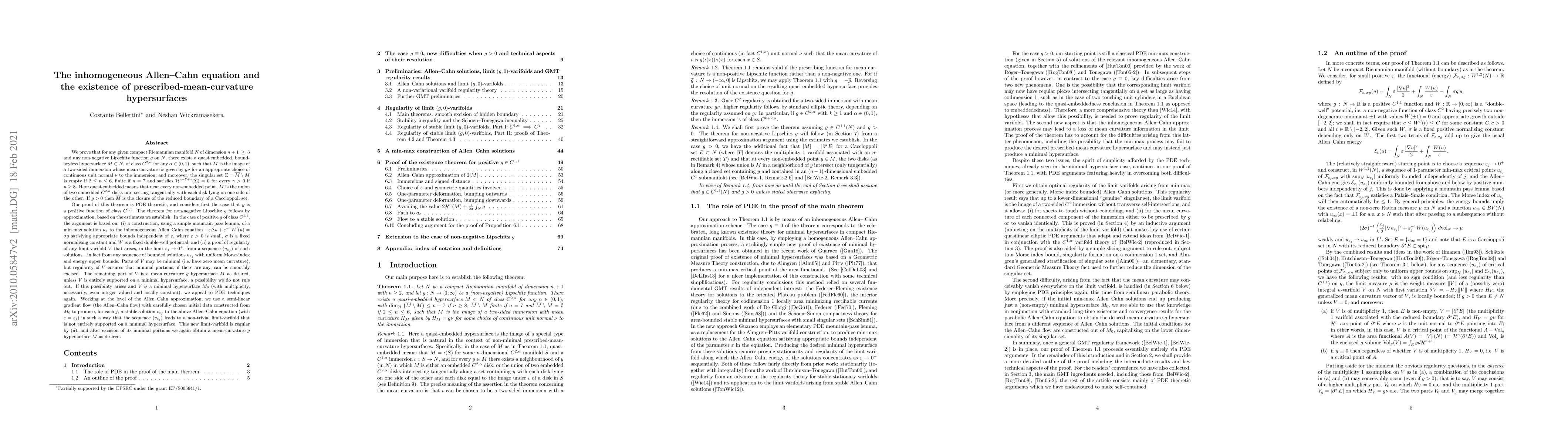 We prove that for any given compact Riemannian manifold $N$ of dimension $n+1 \geq 3$ and any non-negative Lipschitz function $g$ on $N$, there exists a quasi-embedded, boundaryless hypersurface $M \subset N,$ of class $C^{2, \alpha}$ for any $\alpha \in (0,1),$ such that $M$ is the image of a two-sided immersion whose mean curvature is given by $g\nu$ for an appropriate choice of continuous unit normal $\nu$ to the immersion; and moreover, the singular set $\Sigma = \overline{M} \setminus M$ is empty if $2 \leq n \leq 6,$ finite if $n=7$ and satisfies ${\mathcal H}^{n-7 + \gamma}(\Sigma) = 0$ for every $\gamma >0$ if $n \geq 8$. Here quasi-embedded means that near every non-embedded point, $M$ is the union of two embedded $C^{2, \alpha}$ disks intersecting tangentially with each disk lying on one side of the other. If $g >0$ then $\overline{M}$ is the boundary of a Caccioppoli set. Our proof of this theorem is PDE theoretic and relies, when $g>0$ and $g\in C^{1,1}(N)$, on (i) a mountain pass construction of solutions to the inhomogeneous Allen--Cahn equation and (ii) a regularity result for integral varifolds arising from a Morse-index bounded, energy bounded, sequence of solutions to the (inhomogeneous) Allen--Cahn equation. The case of non-negative Lipschitz $g$ follows by approximation, based on the estimates that we establish.