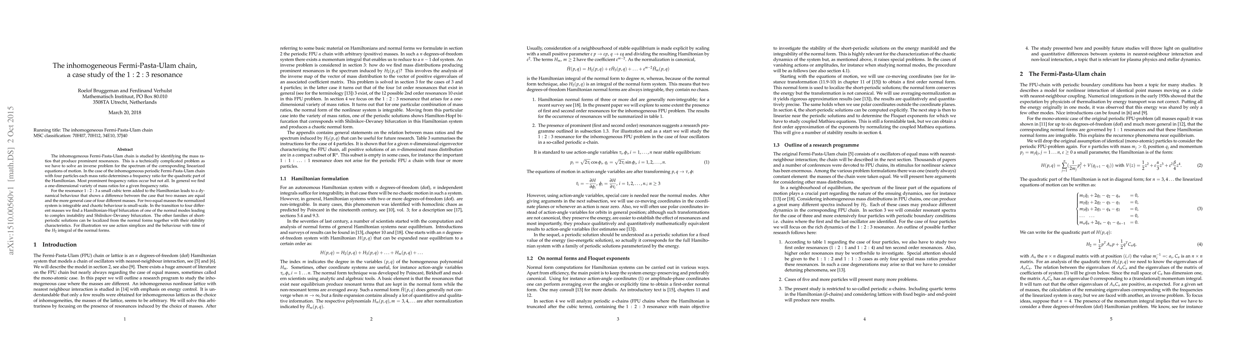 The inhomogeneous Fermi-Pasta-Ulam chain is studied by identifying the mass ratios that produce prominent resonances. This is a technically complicated problem as we have to solve an inverse problem for the spectrum of the corresponding linearized equations of motion. In the case of the inhomogeneous periodic Fermi-Pasta-Ulam chain with four particles each mass ratio determines a frequency ratio for the quadratic part of the Hamiltonian. Most prominent frequency ratios occur but not all. In general we find a one-dimensional variety of mass ratios for a given frequency ratio. For the resonance 1:2:3 a small cubic term added to the Hamiltonian leads to a dynamical behaviour that shows a difference between the case that two masses are equal and the more general case of four different masses. For two equal masses the normalized system is integrable and chaotic behaviour is small-scale. In the transition to four different masses we find a Hamiltonian-Hopf bifurcation of one of the normal modes leading to complex instability and Shilnikov-Devaney bifurcation. The other families of short-periodic solutions can be localized from the normal forms together with their stability characteristics. For illustration we use action simplices and the behaviour with time of the H_2 integral of the normal forms.
