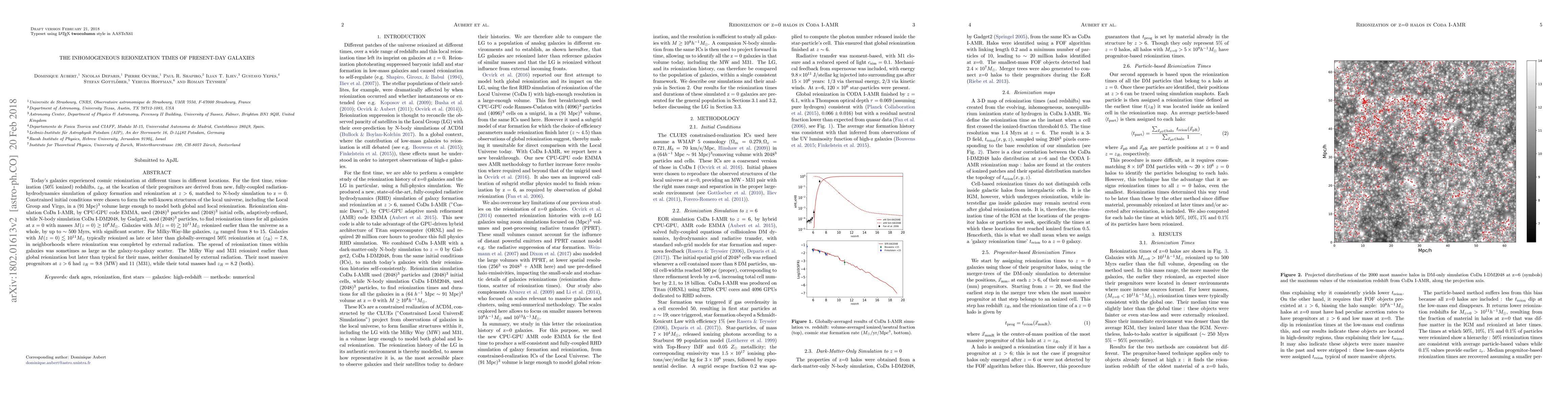 This paper investigates the varied reionization times of present-day galaxies using advanced simulations, revealing that galaxies reionized at different redshifts depending on their mass and local environment. Milky-Way-like galaxies reionized between $z_R$ = 8 to 15, while less massive galaxies typically reionized later than the global average at $z_R$ = 7.8.