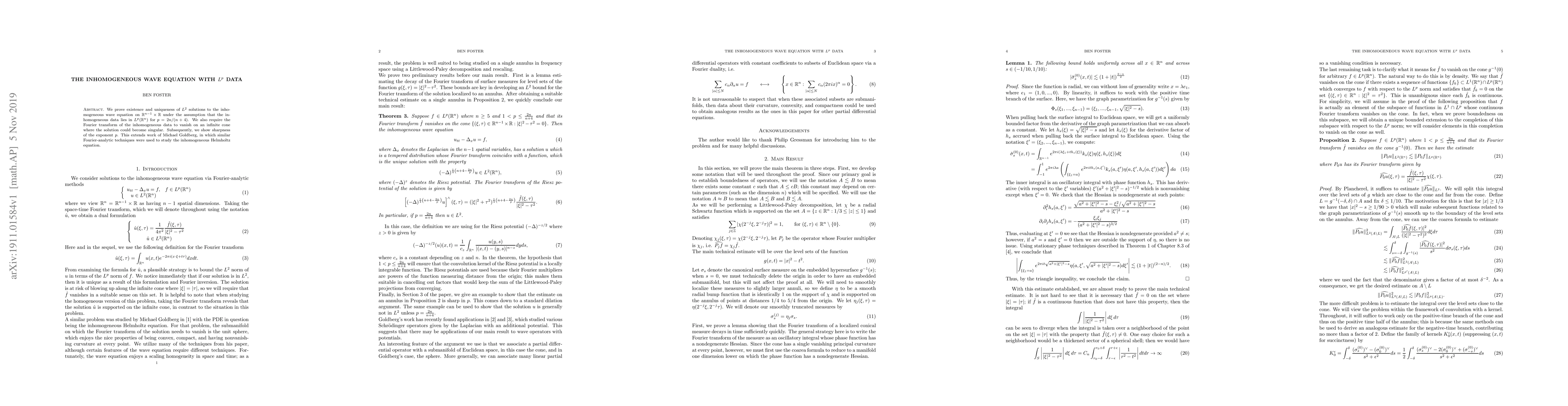 We prove existence and uniqueness of $L^2$ solutions to the inhomogeneous wave equation on $\mathbb{R}^{n-1}\times\mathbb{R}$ under the assumption that the inhomogeneous data lies in $L^p(\mathbb{R}^n)$ for $p=2n/(n+4)$. We also require the Fourier transform of the inhomogeneous data to vanish on an infinite cone where the solution could become singular. Subsequently, we show sharpness of the exponent $p$. This extends work of Michael Goldberg, in which similar Fourier-analytic techniques were used to study the inhomogeneous Helmholtz equation.