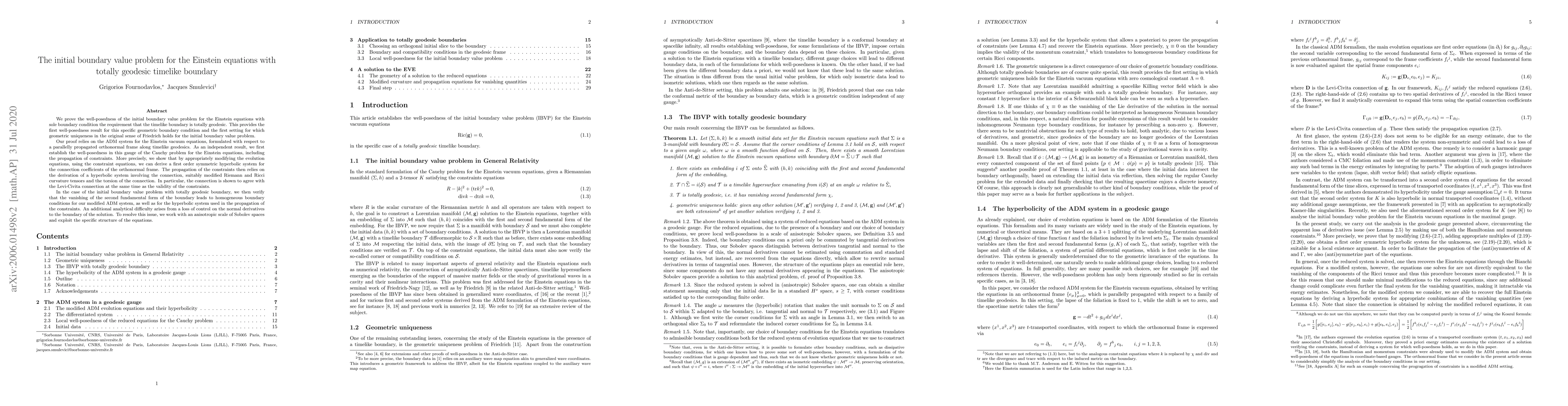 We prove the well-posedness of the initial boundary value problem for the Einstein equations with sole boundary condition the requirement that the timelike boundary is totally geodesic. This provides the first well-posedness result for this specific geometric boundary condition and the first setting for which geometric uniqueness in the original sense of Friedrich holds for the initial boundary value problem. Our proof relies on the ADM system for the Einstein vacuum equations, formulated with respect to a parallelly propagated orthonormal frame along timelike geodesics. As an independent result, we first establish the well-posedness in this gauge of the Cauchy problem for the Einstein equations, including the propagation of constraints. More precisely, we show that by appropriately modifying the evolution equations, using the constraint equations, we can derive a first order symmetric hyperbolic system for the connection coefficients of the orthonormal frame. The propagation of the constraints then relies on the derivation of a hyperbolic system involving the connection, suitably modified Riemann and Ricci curvature tensors and the torsion of the connection. In particular, the connection is shown to agree with the Levi-Civita connection at the same time as the validity of the constraints. In the case of the initial boundary value problem with totally geodesic boundary, we then verify that the vanishing of the second fundamental form of the boundary leads to homogeneous boundary conditions for our modified ADM system, as well as for the hyperbolic system used in the propagation of the constraints. An additional analytical difficulty arises from a loss of control on the normal derivatives to the boundary of the solution. To resolve this issue, we work with an anisotropic scale of Sobolev spaces and exploit the specific structure of the equations.