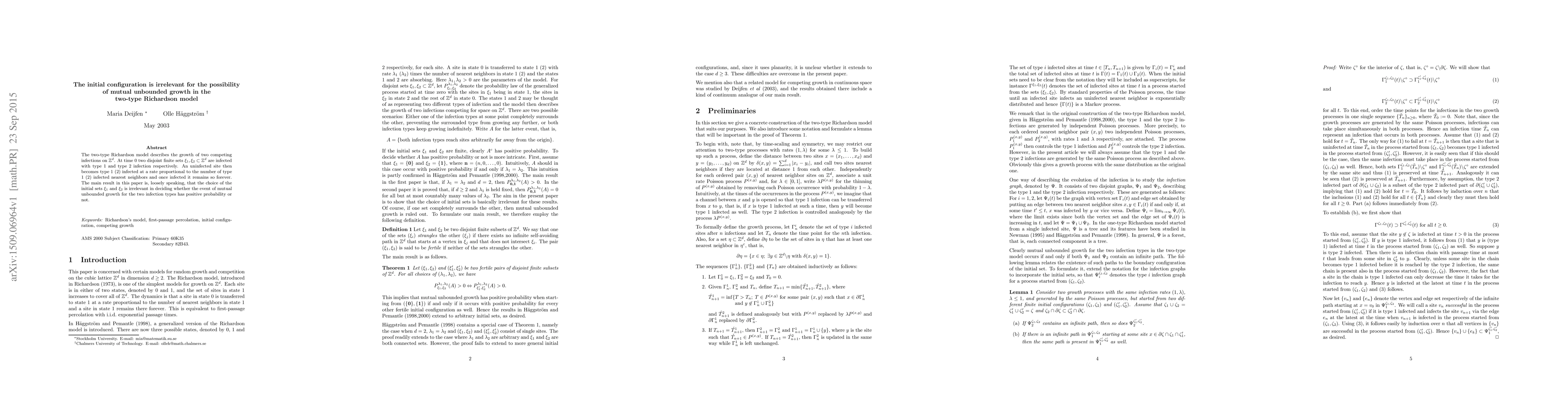 The two-type Richardson model describes the growth of two competing infections on $\mathbb{Z}^d$. At time 0 two disjoint finite sets $\xi_1,\xi_2\subset \mathbb{Z}^d$ are infected with type 1 and type 2 infection respectively. An uninfected site then becomes type 1 (2) infected at a rate proportional to the number of type 1 (2) infected nearest neighbors and once infected it remains so forever. The main result in this paper is, loosely speaking, that the choice of the initial sets $\xi_1$ and $\xi_2$ is irrelevant in deciding whether the event of mutual unbounded growth for the two infection types has positive probability or not.