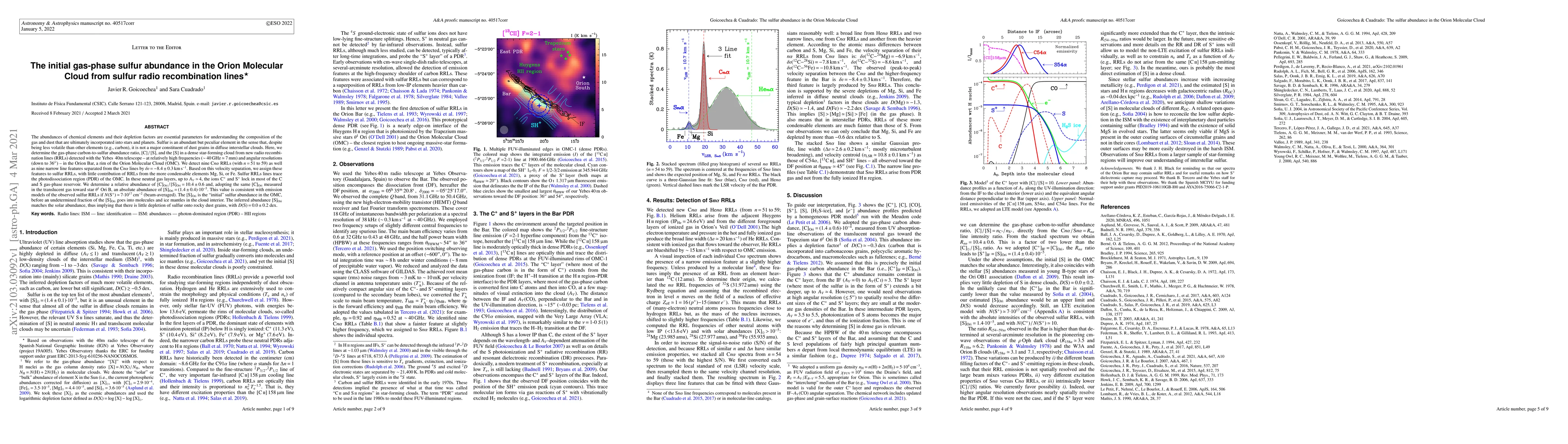 This study determines the initial gas-phase sulfur abundance in the Orion Molecular Cloud using sulfur radio recombination lines detected with the Yebes 40m telescope. The research finds an absolute sulfur abundance of [S]_Ori=(1.4±0.4)×10^-5, indicating minimal depletion of sulfur onto dust grains, with D(S)=0.0±0.2 dex.