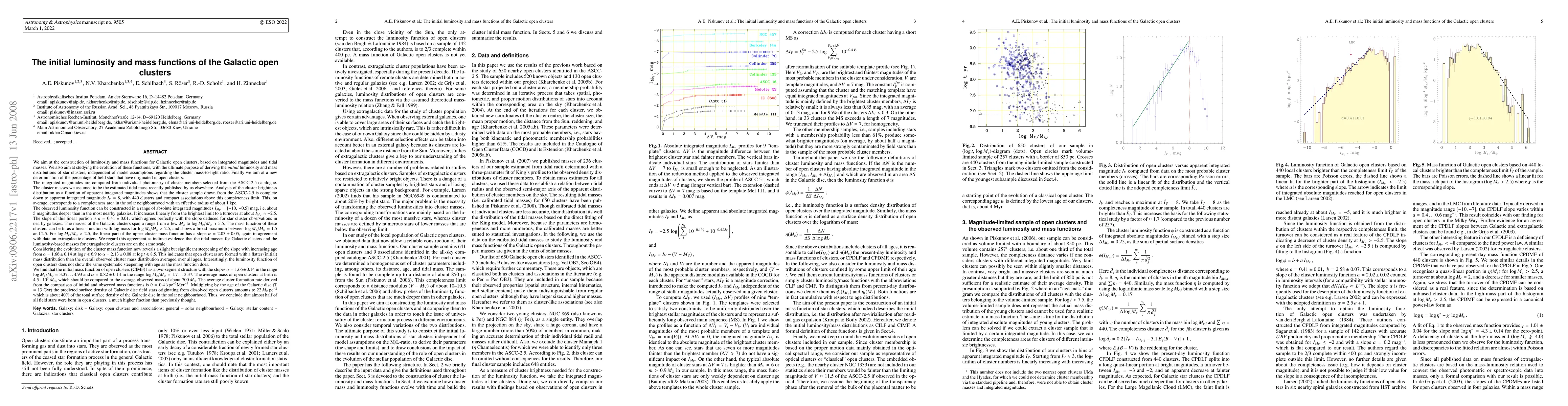 This paper investigates the luminosity and mass functions of Galactic open clusters, finding a linear increase in luminosity up to a turnover point. It reveals a two-segment initial mass function with different slopes, indicating that the average mass of open clusters at birth is significantly higher than their current observed mass, suggesting that nearly half of all field stars in the Galactic disc originated from dissolved open clusters.