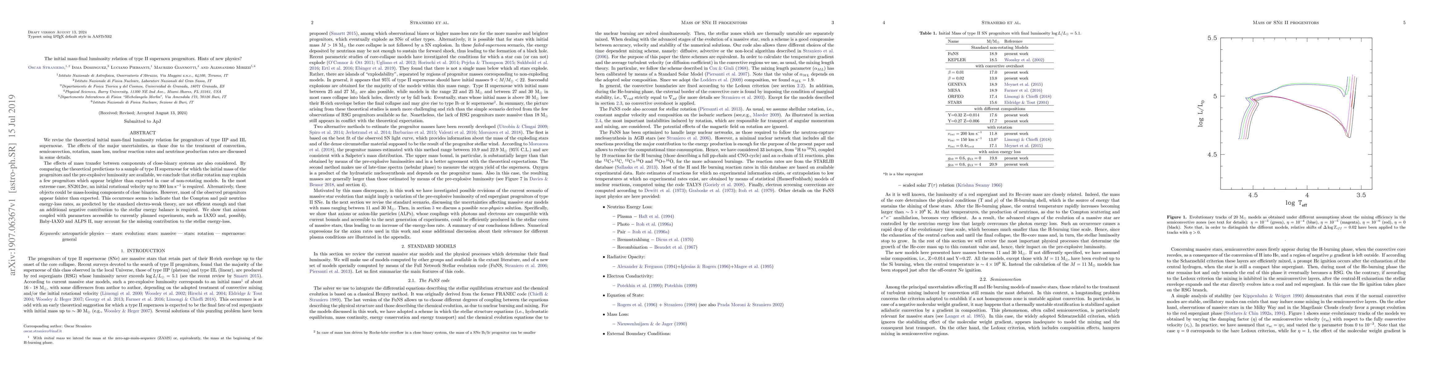 We revise the theoretical initial mass-final luminosity relation for progenitors of type IIP and IIL supernovae. The effects of the major uncertainties, as those due to the treatment of convection, semiconvection, rotation, mass loss, nuclear reaction rates and neutrinos production rates are discussed in some details. The effects of mass transfer between components of close-binary systems are also considered. By comparing the theoretical predictions to a sample of type II supernovae for which the initial mass of the progenitors and the pre-explosive luminosity are available, we conclude that stellar rotation may explain a few progenitors which appear brighter than expected in case of non-rotating models. In the most extreme case, SN2012ec, an initial rotational velocity up to 300 km s$^{-1}$ is required. Alternatively, these objects could be mass-loosing components of close binaries. However, most of the observed progenitors appear fainter than expected. This occurrence seems to indicate that the Compton and pair neutrino energy-loss rates, as predicted by the standard electro-weak theory, are not efficient enough and that an additional negative contribution to the stellar energy balance is required. We show that axions coupled with parameters accessible to currently planned experiments, such as IAXO and, possibly, Baby-IAXO and ALPS II, may account for the missing contribution to the stellar energy-loss.