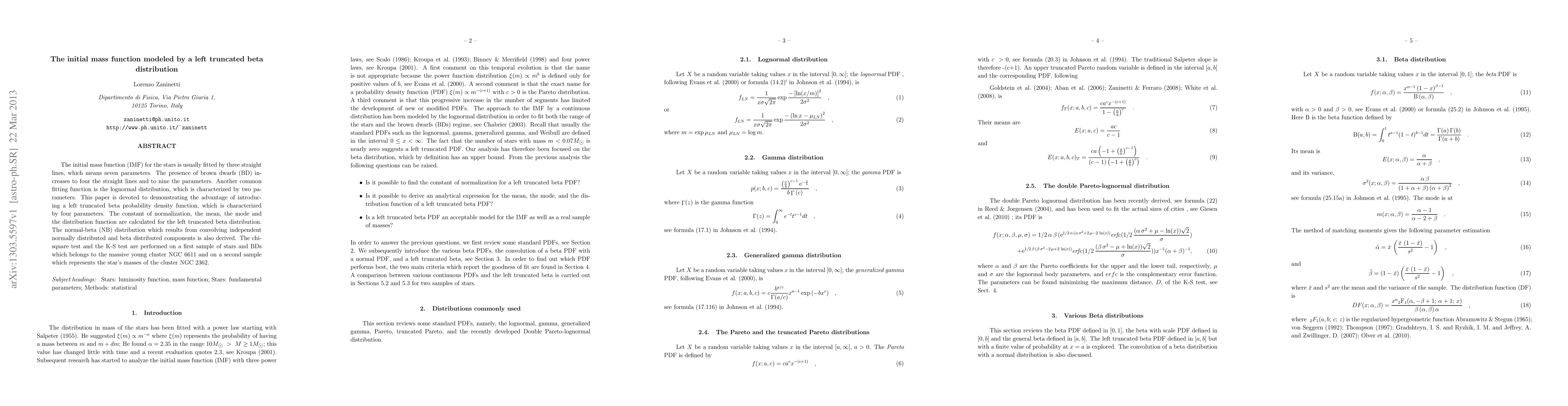 The initial mass function (IMF) for the stars is usually fitted by three straight lines, which means seven parameters. The presence of brown dwarfs (BD) increases to four the straight lines and to nine the parameters. Another common fitting function is the lognormal distribution, which is characterized by two parameters. This paper is devoted to demonstrating the advantage of introducing a left truncated beta probability density function, which is characterized by four parameters. The constant of normalization, the mean, the mode and the distribution function are calculated for the left truncated beta distribution. The normal-beta (NB) distribution which results from convolving independent normally distributed and beta distributed components is also derived. The chi-square test and the K-S test are performed on a first sample of stars and BDs which belongs to the massive young cluster NGC 6611 and on a second sample which represents the star's masses of the cluster NGC 2362.