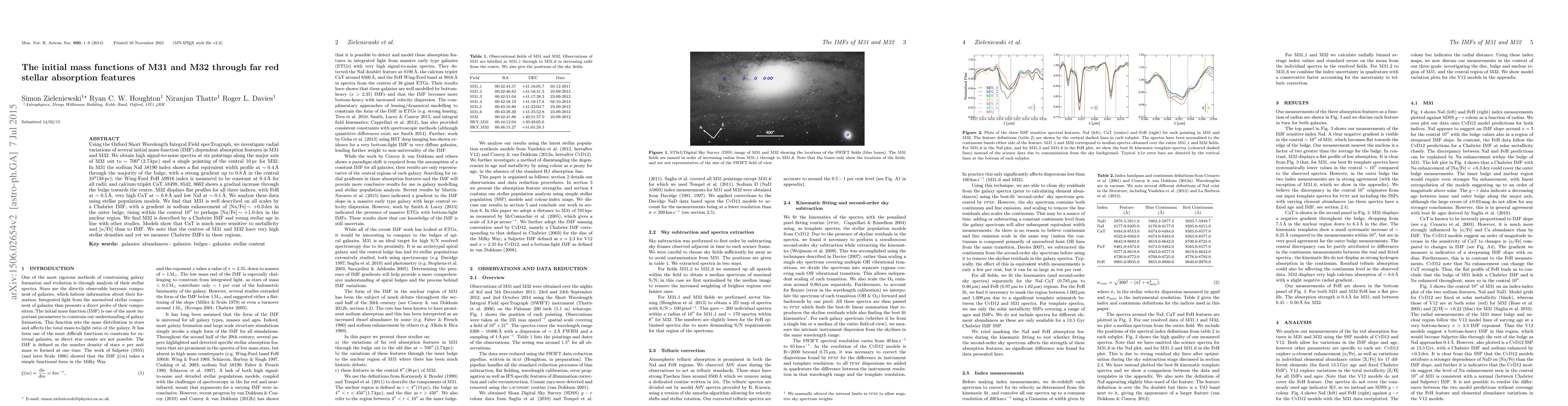 This study uses SWIFT to analyze stellar absorption features in M31 and M32, finding radial variations in M31's initial mass function (IMF) dependent indices. M31 shows a Chabrier IMF with a sodium gradient, while M32 exhibits a flat profile and young stellar age, also consistent with a Chabrier IMF.