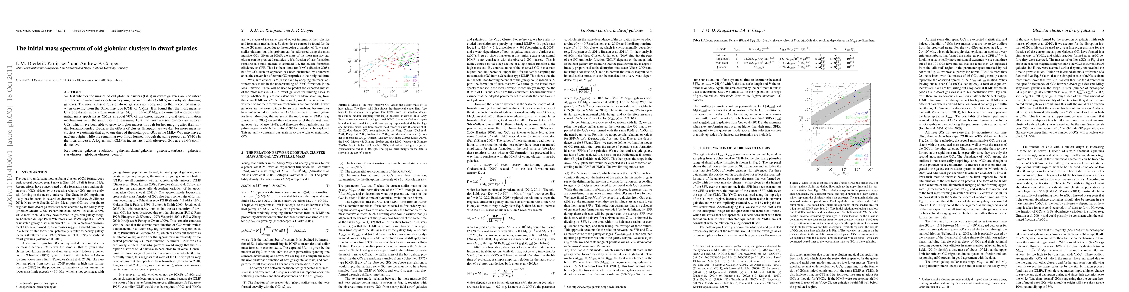We test whether the masses of old globular clusters (GCs) in dwarf galaxies are consistent with the same initial mass spectrum as young massive clusters (YMCs) in nearby star-forming galaxies. The most massive GCs of dwarf galaxies are compared to their expected masses when drawing from the Schechter-type ICMF of YMCs. It is found that the most massive GCs of galaxies in the stellar mass range M_*,gal=10^7-10^9 Msun are consistent with the same initial mass spectrum as YMCs in about 90% of the cases, suggesting that their formation mechanisms were the same. For the remaining 10%, the most massive clusters are nuclear GCs, which have been able to grow to higher masses through further merging after their initial formation ended. Because the effects of cluster disruption are weaker for more massive clusters, we estimate that up to one third of the metal-poor GCs in the Milky Way may have a nuclear origin, while the remaining two thirds formed through the same process as YMCs in the local universe. A log-normal ICMF is inconsistent with observed GCs at a 99.6% confidence level.