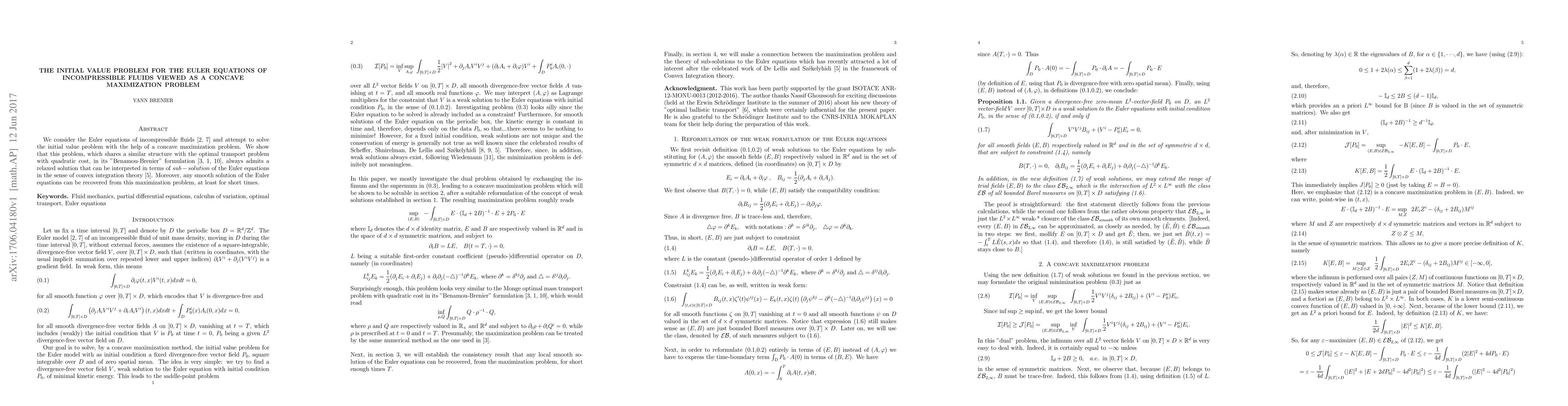 We consider the Euler equations of incompressible fluids and attempt to solve the initial value problem with the help of a concave maximization problem.We show that this problem, which shares a similar structure with the optimal transport problemwith quadratic cost, in its "Benamou-Brenier" formulation,always admits a relaxed solution that can be interpretedin terms of $sub-solution$ of the Euler equations in the sense of convex integration theory.Moreover, any smooth solution of the Euler equations can be recovered from this maximization problem, at least for short times.