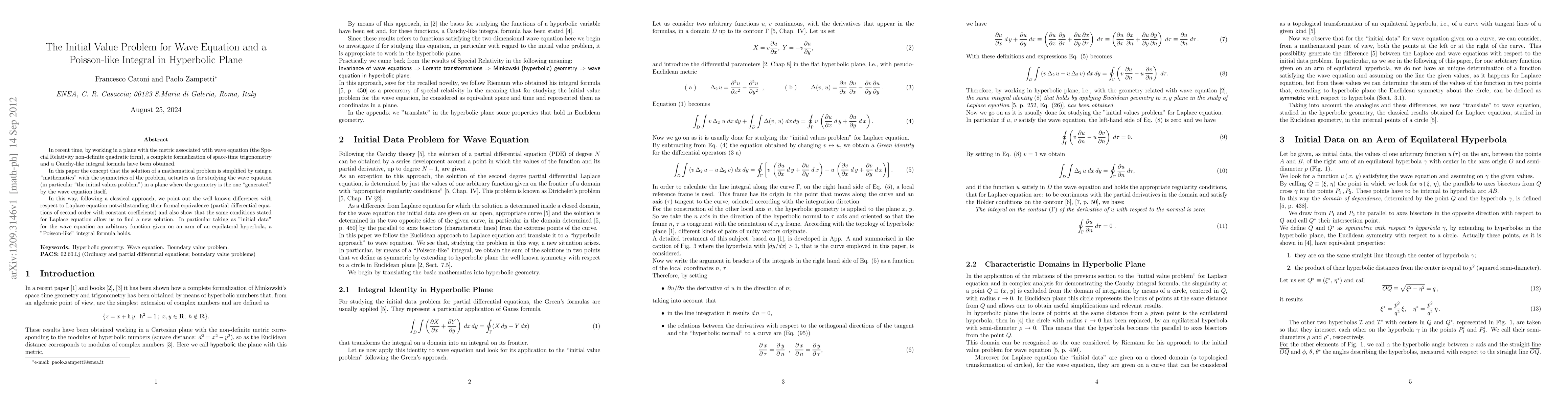 In recent time, by working in a plane with the metric associated with wave equation (the Special Relativity non-definite quadratic form), a complete formalization of space-time trigonometry and a Cauchy-like integral formula have been obtained. In this paper the concept that the solution of a mathematical problem is simplified by using a "mathematics" with the symmetries of the problem, actuates us for studying the wave equation (in particular "the initial values problem") in a plane where the geometry is the one "generated" by the wave equation itself. In this way, following a classical approach, we point out the well known differences with respect to Laplace equation notwithstanding their formal equivalence (partial differential equations of second order with constant coefficients) and also show that the same conditions stated for Laplace equation allow us to find a new solution. In particular taking as "initial data" for the wave equation an arbitrary function given on an arm of an equilateral hyperbola, a "Poisson-like" integral formula holds.