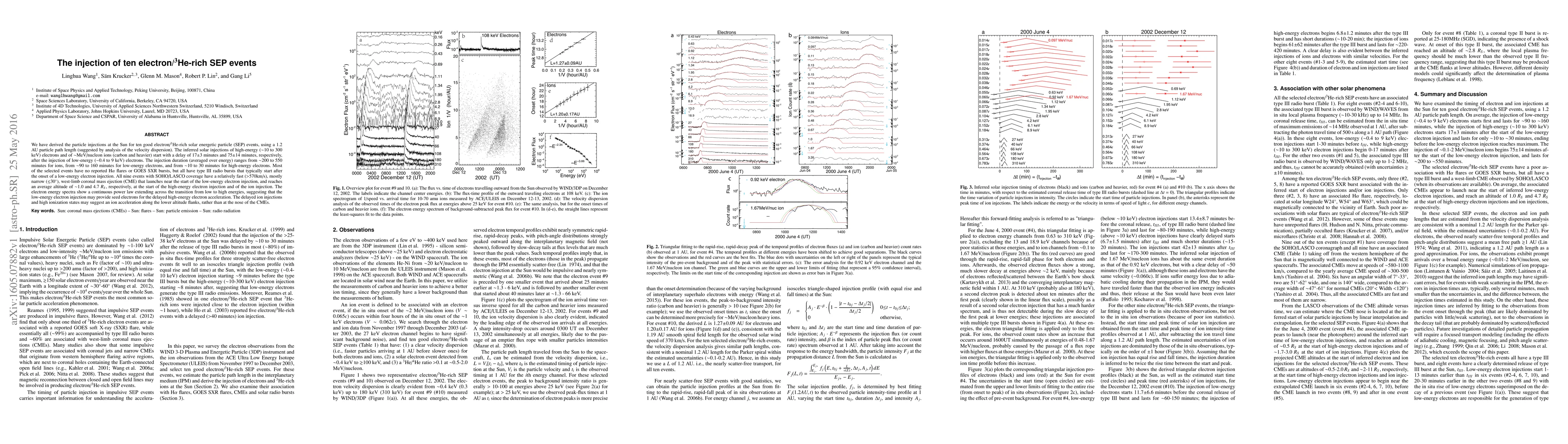 This research identifies characteristics of ten electron/³He-rich solar energetic particle (SEP) events. It finds that high-energy electron and ion injections follow low-energy electron injections by 17±3 and 75±14 minutes respectively, with varying injection durations. Most events lack Hα flares or GOES SXR bursts but have type III radio bursts. Fast, narrow CMEs accompany these events, launching near the start of low-energy electron injection. The study suggests seed electrons for high-energy acceleration come from the low-energy injection, and ion acceleration may occur along CME flanks rather than at the nose.