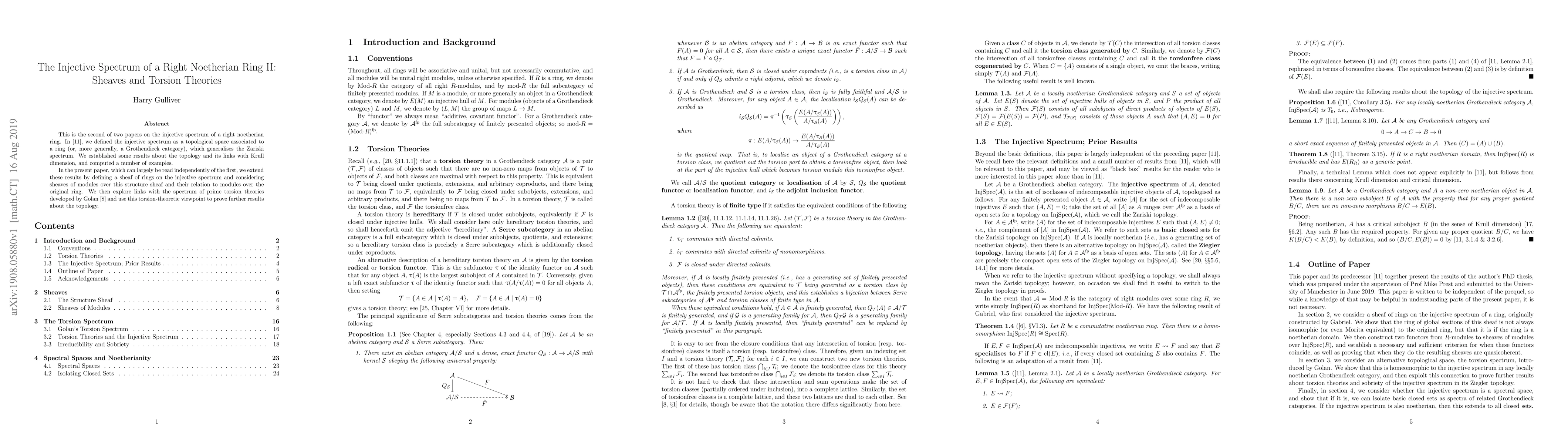This paper builds on previous work on the injective spectrum of a right noetherian ring, defining a sheaf of rings on the injective spectrum and examining sheaves of modules over this structure. It explores the connection between these sheaves and modules over the original ring, and uses torsion theories to further analyze the topology of the injective spectrum.