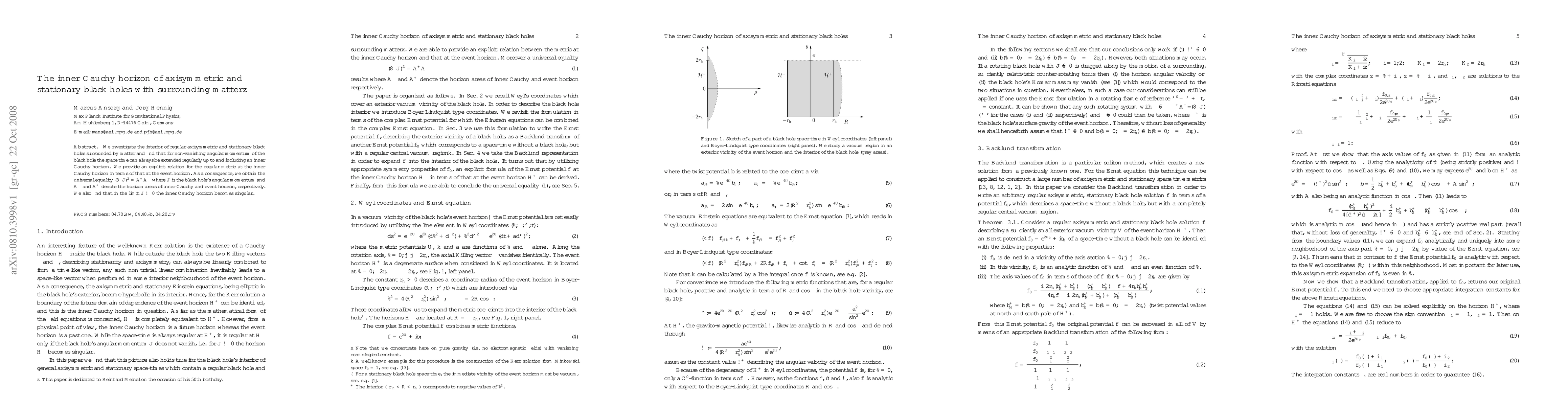 This paper explores the interior of axisymmetric and stationary black holes with surrounding matter, demonstrating that non-zero angular momentum allows for a regular extension to the inner Cauchy horizon. It establishes a relation between the inner Cauchy and event horizons, leading to a universal equality involving the black hole's angular momentum and horizon areas.