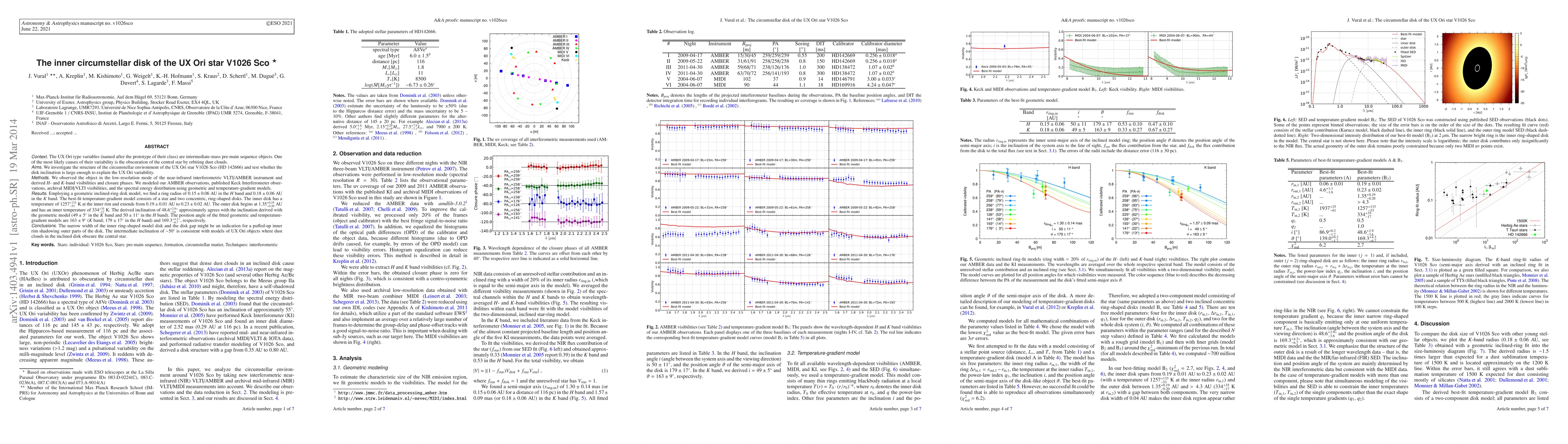 The UX Ori type variables (named after the prototype of their class) are intermediate-mass pre-main sequence objects. One of the most likely causes of their variability is the obscuration of the central star by orbiting dust clouds. We investigate the structure of the circumstellar environment of the UX~Ori star V1026 Sco (HD 142666) and test whether the disk inclination is large enough to explain the UX Ori variability. We observed the object in the low-resolution mode of the near-infrared interferometric VLTI/AMBER instrument and derived H- and K-band visibilities and closure phases. We modeled our AMBER observations, published Keck Interferometer observations, archival MIDI/VLTI visibilities, and the spectral energy distribution using geometric and temperature-gradient models. Employing a geometric inclined-ring disk model, we find a ring radius of 0.15 +- 0.06 AU in the H band and 0.18 +- 0.06 AU in the K band. The best-fit temperature-gradient model consists of a star and two concentric, ring-shaped disks. The inner disk has a temperature of 1257^{+133}_{-53} K at the inner rim and extends from 0.19 +- 0.01 AU to 0.23 +- 0.02 AU. The outer disk begins at 1.35^{+0.19}_{-0.20} AU and has an inner temperature of 334^{+35}_{-17} K. The derived inclination of 48.6^{+2.9}_{-3.6}deg approximately agrees with the inclination derived with the geometric model (49 +- 5deg in the K band and 50 +- 11deg in the H band). The position angle of the fitted geometric and temperature-gradient models are 163 +- 9deg (K band; 179 +- 17deg in the H band) and 169.3^{+4.2}_{-6.7}deg, respectively. The narrow width of the inner ring-shaped model disk and the disk gap might be an indication for a puffed-up inner rim shadowing outer parts of the disk. The intermediate inclination of ~50deg is consistent with models of UX Ori objects where dust clouds in the inclined disk obscure the central star.