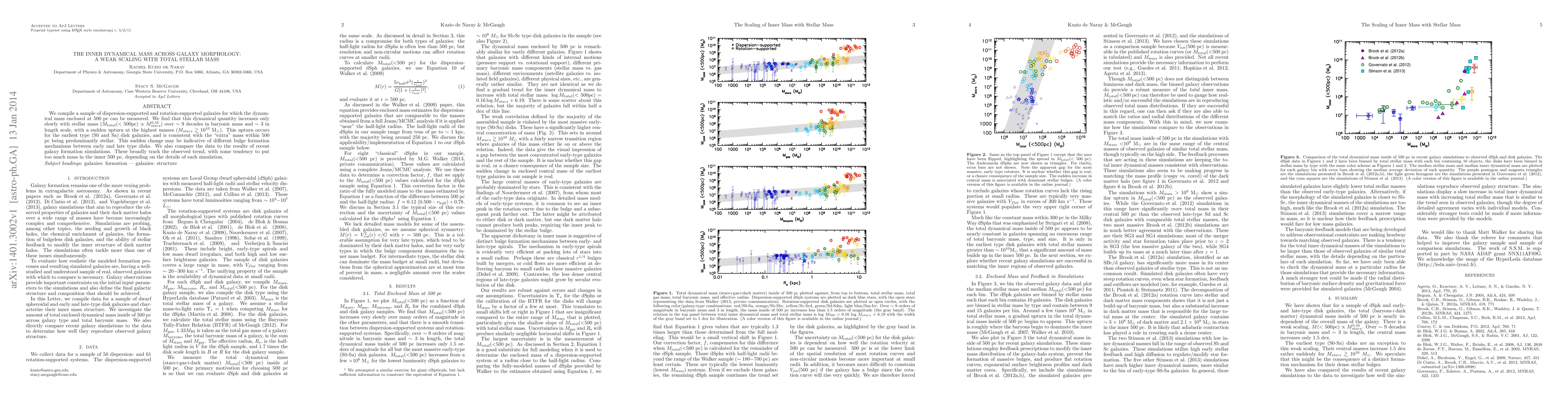 We compile a sample of dispersion-supported and rotation-supported galaxies for which the dynamical mass enclosed at 500 pc can be measured. We find that this dynamical quantity increases only slowly with stellar mass (M$_{total}$(<500pc) $\propto$ M$_{stars}$$^{0.16}$) over ~9 decades in baryonic mass and ~3 in length scale, with a sudden upturn at the highest masses (M$_{stars}$ > 10$^{10}$M$_{sun}$). This upturn occurs for the earliest type (S0 and Sa) disk galaxies, and is consistent with the "extra" mass within 500 pc being predominantly stellar. This sudden change may be indicative of different bulge formation mechanisms between early and late type disks. We also compare the data to the results of recent galaxy formation simulations. These broadly track the observed trend, with some tendency to put too much mass in the inner 500 pc, depending on the details of each simulation.