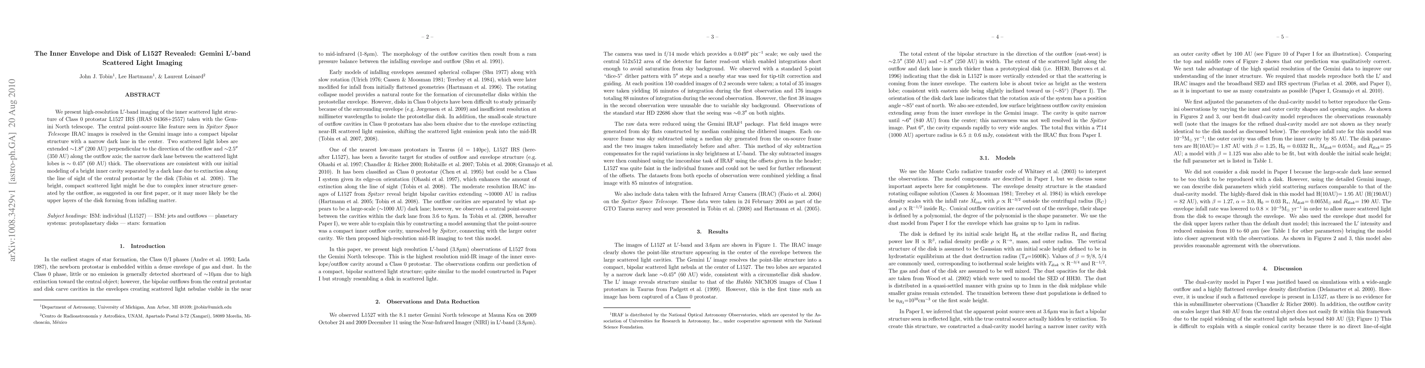 High-resolution L'-band imaging of Class 0 protostar L1527 IRS reveals a compact bipolar structure with a narrow dark lane, suggesting a bright inner cavity separated by a disk-induced dark lane. The scattered light lobes extend perpendicularly and along the outflow axis, indicating complex inner disk dynamics.