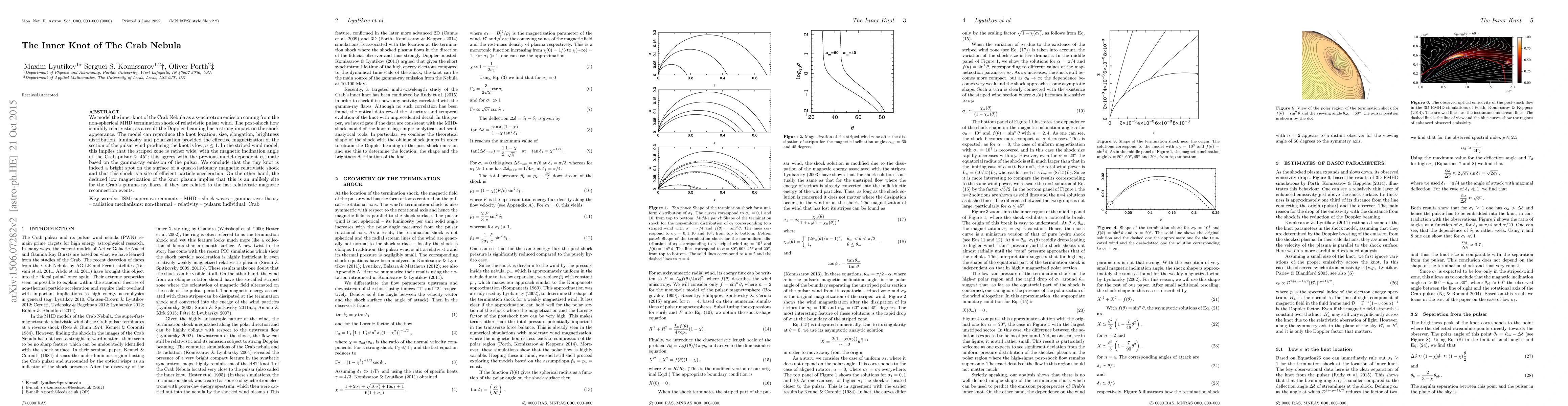 Researchers model the Crab Nebula's inner knot as a shock from relativistic pulsar wind, proposing it's a site of efficient particle acceleration with low magnetization, which contradicts previous theories about gamma-ray flares.