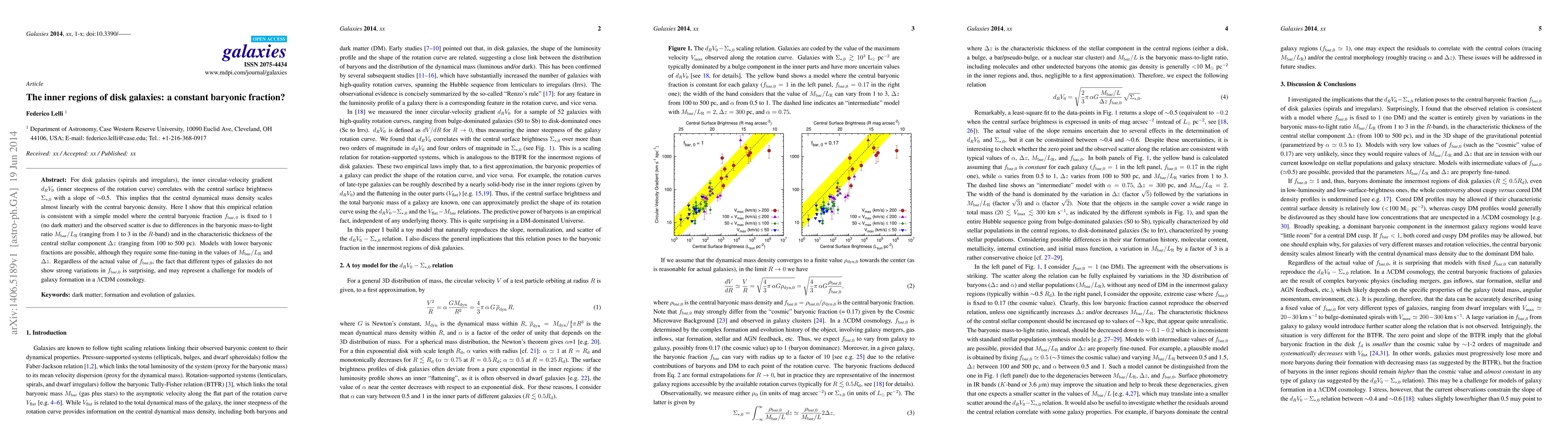 For disk galaxies (spirals and irregulars), the inner circular-velocity gradient (inner steepness of the rotation curve) correlates with the central surface brightness with a slope of ~0.5. This implies that the central dynamical mass density scales almost linearly with the central baryonic density. Here I show that this empirical relation is consistent with a simple model where the central baryonic fraction f_bar(0) is fixed to 1 (no dark matter) and the observed scatter is due to differences in the baryonic mass-to-light ratio M_bar/L (ranging from 1 to 3 in the R-band) and in the characteristic thickness of the central stellar component dz (ranging from 100 to 500 pc). Models with lower baryonic fractions are possible, although they require some fine-tuning in the values of M_bar/L and dz. Regardless of the actual value of f_bar(0), the fact that different types of galaxies do not show strong variations in f_bar(0) is surprising, and may represent a challenge for models of galaxy formation in a LCDM cosmology.