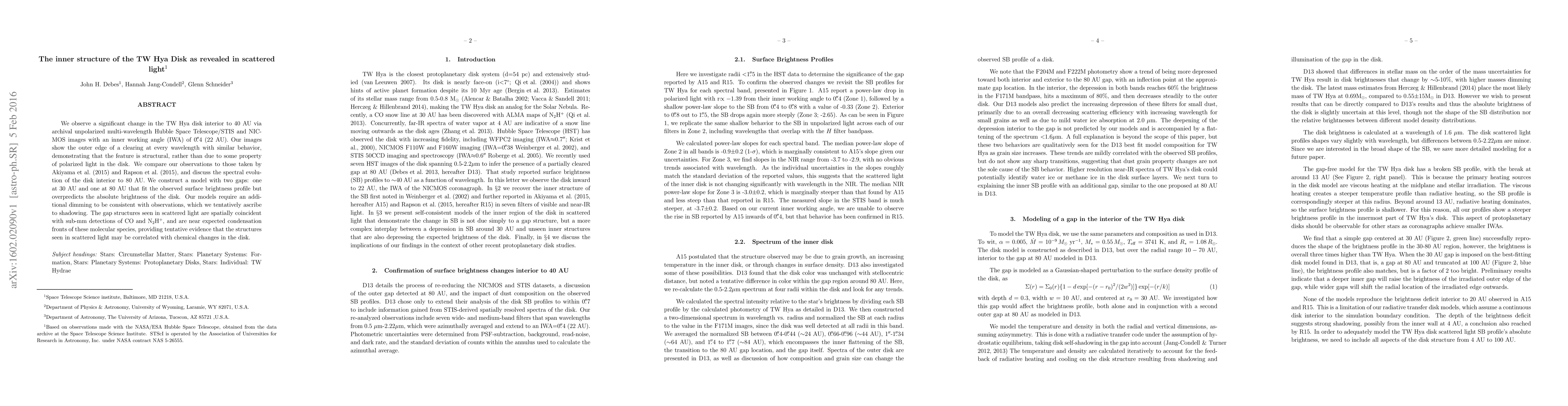 We observe a significant change in the TW Hya disk interior to 40~AU via archival unpolarized multi-wavelength Hubble Space Telescope/STIS and NICMOS images with an inner working angle (IWA) of 0\farcs4 (22~AU). Our images show the outer edge of a clearing at every wavelength with similar behavior, demonstrating that the feature is structural, rather than due to some property of polarized light in the disk. We compare our observations to those taken by Akiyama et al. (2015) and Rapson et al. (2015), and discuss the spectral evolution of the disk interior to 80~AU. We construct a model with two gaps: one at 30~AU and one at 80~AU that fit the observed surface brightness profile but overpredicts the absolute brightness of the disk. Our models require an additional dimming to be consistent with observations, which we tentatively ascribe to shadowing. The gap structures seen in scattered light are spatially coincident with sub-mm detections of CO and N$_2$H$^+$, and are near expected condensation fronts of these molecular species, providing tentative evidence that the structures seen in scattered light may be correlated with chemical changes in the disk.