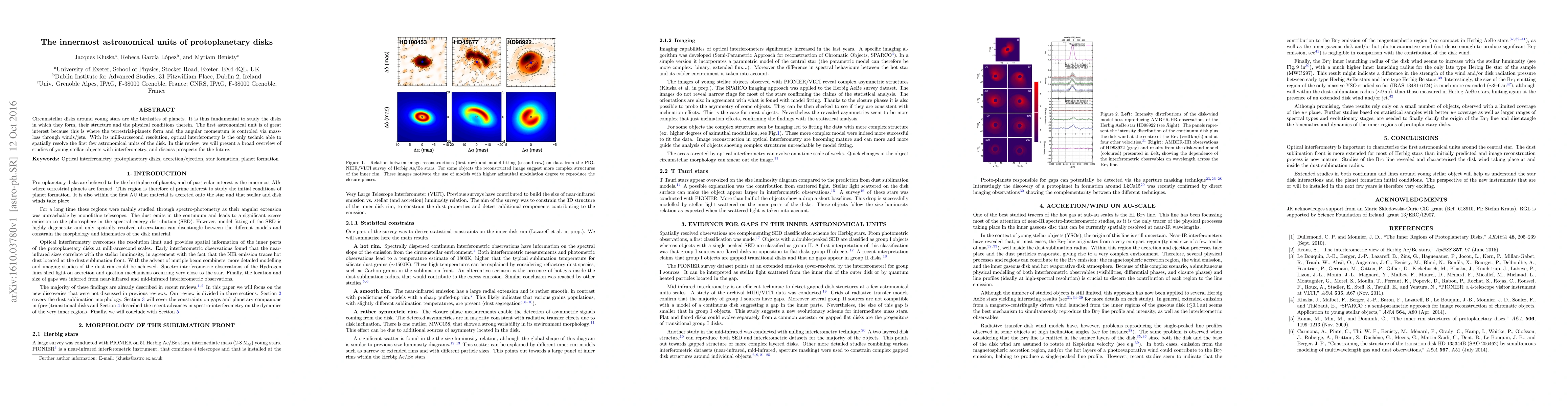 Circumstellar disks around young stars are the birthsites of planets. It is thus fundamental to study the disks in which they form, their structure and the physical conditions therein. The first astronomical unit is of great interest because this is where the terrestrial-planets form and the angular momentum is controled via massloss through winds/jets. With its milli-arcsecond resolution, optical interferometry is the only technic able to spatially resolve the first few astronomical units of the disk. In this review, we will present a broad overview of studies of young stellar objects with interferometry, and discuss prospects for the future.
