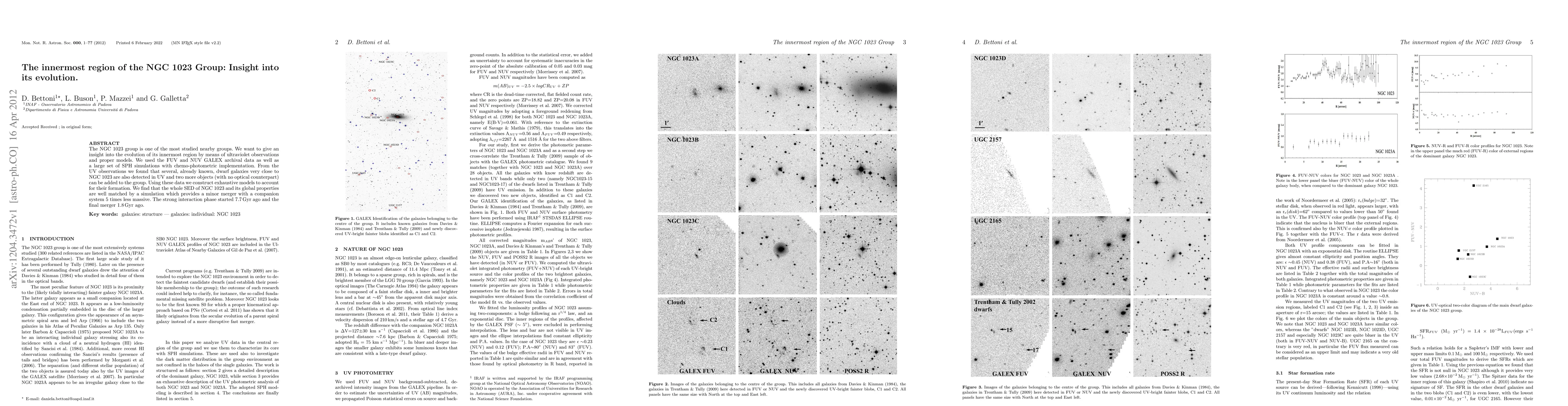 The NGC 1023 group is one of the most studied nearby groups. We want to give an insight into the evolution of its innermost region by means of ultraviolet observations and proper models. We used the FUV and NUV GALEX archival data as well as a large set of SPH simulations with chemo-photometric implementation. From the UV observations we found that several, already known, dwarf galaxies very close to NGC 1023 are also detected in UV and two more objects (with no optical counterpart) can be added to the group. Using these data we construct exhaustive models to account for their formation. We find that the whole SED of NGC 1023 and its global properties are well matched by a simulation which provides a minor merger with a companion system 5 times less massive. The strong interaction phase started 7.7 Gyr ago and the final merger 1.8 Gyr ago.