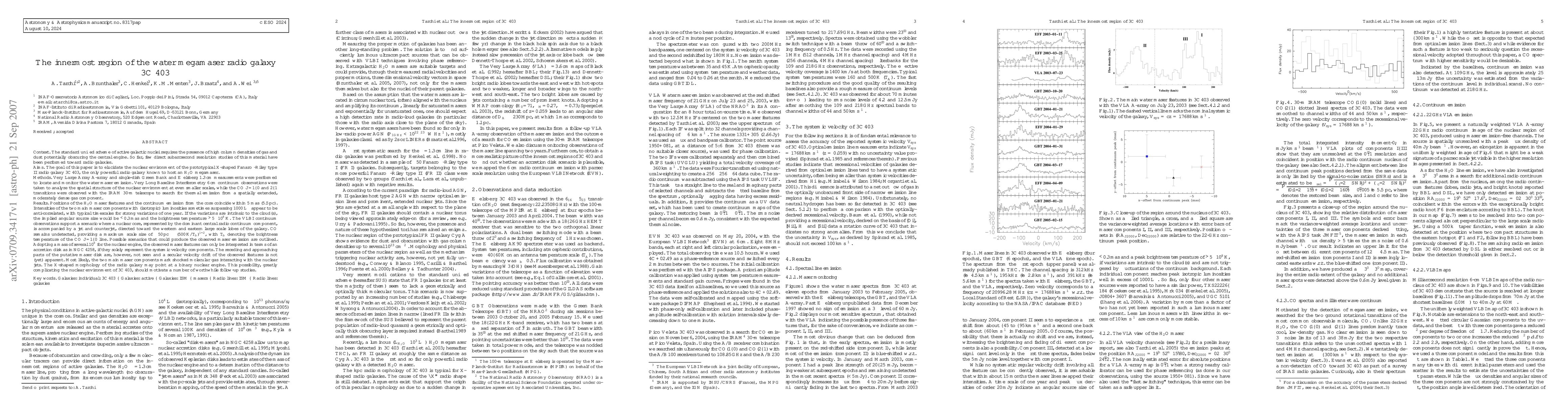 The standard unified scheme of active galactic nuclei requires the presence of high column densities of gas and dust potentially obscuring the central engine. So far, few direct subarcsecond resolution studies of this material have been performed toward radio galaxies. The goal of this paper is to elucidate the nuclear environment of the prototypical X-shaped Fanaroff-Riley type II radio galaxy 3C403, the only powerful radio galaxy known to host a water megamaser. Very Large Array A-array and single-dish Green Bank and Effelsberg 1.3 cm measurements were performed to locate and monitor the water maser emission. Very Long Baseline Interferometry 6 cm continuum observations were taken to analyze the spatial structure of the nuclear environment at even smaller scales, while the CO J=1-0 and 2-1 transitions were observed with the IRAM 30-m telescope to search for thermal emission from a spatially extended, moderately dense gas component.[abridged]