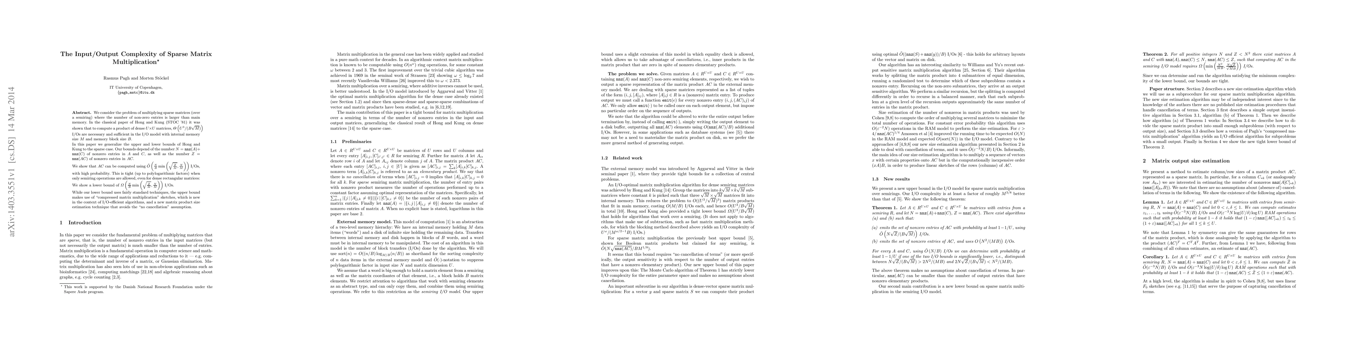 Researchers have established new bounds for computing sparse matrix multiplication in terms of I/O operations, showing that it can be done using an efficient number of inputs/outputs even with limited memory. The findings improve upon earlier work and introduce new techniques such as compressed matrix multiplication sketches.