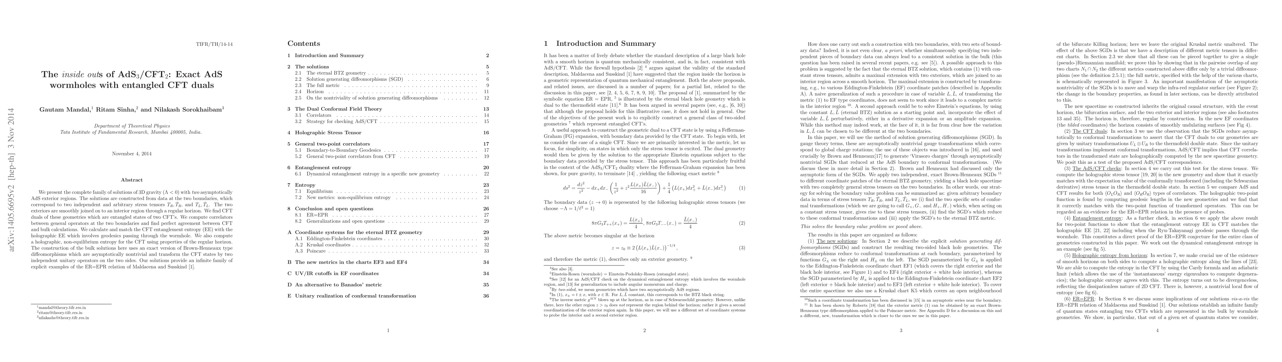 We present the complete family of solutions of 3D gravity (Lambda<0) with two asymptotically AdS exterior regions. The solutions are constructed from data at the two boundaries, which correspond to two independent and arbitrary stress tensors T_R, \bar T_R, and T_L, \bar T_L. The two exteriors are smoothly joined on to an interior region through a regular horizon. We find CFT duals of these geometries which are entangled states of two CFT's. We compute correlators between general operators at the two boundaries and find perfect agreement between CFT and bulk calculations. We calculate and match the CFT entanglement entropy (EE) with the holographic EE which involves geodesics passing through the wormhole. We also compute a holographic, non-equilibrium entropy for the CFT using properties of the regular horizon. The construction of the bulk solutions here uses an exact version of Brown-Henneaux type diffeomorphisms which are asymptotically nontrivial and transform the CFT states by two independent unitary operators on the two sides. Our solutions provide an infinite family of explicit examples of the ER=EPR relation of Maldacena and Susskind [arXiv:1306.0533].