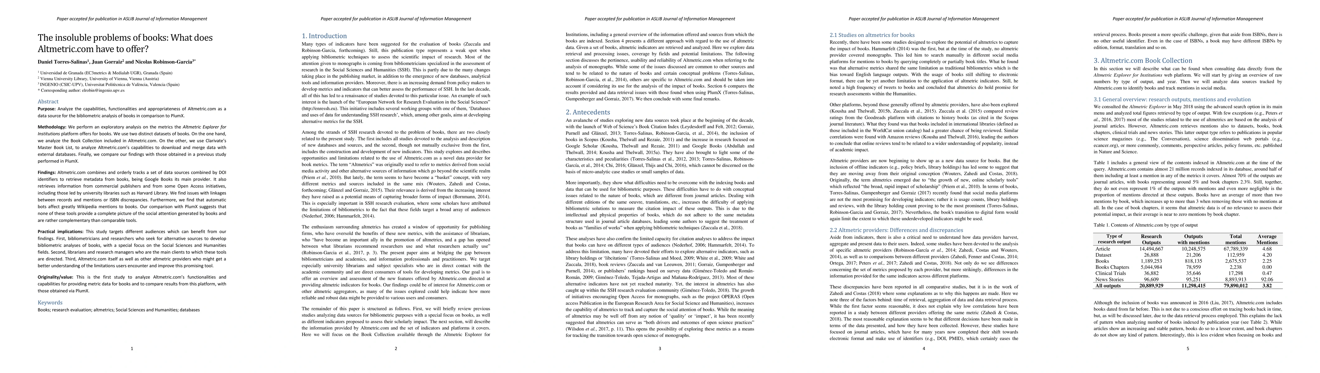 This paper examines Altmetric.com for bibliometric analysis of books, comparing it with PlumX. It finds Altmetric.com effectively combines data from sources like Google Books and commercial publishers, but encounters issues such as linkage problems and bot-inflated Wikipedia mentions. The study concludes that neither tool fully captures book social attention, making them complementary rather than comparable.