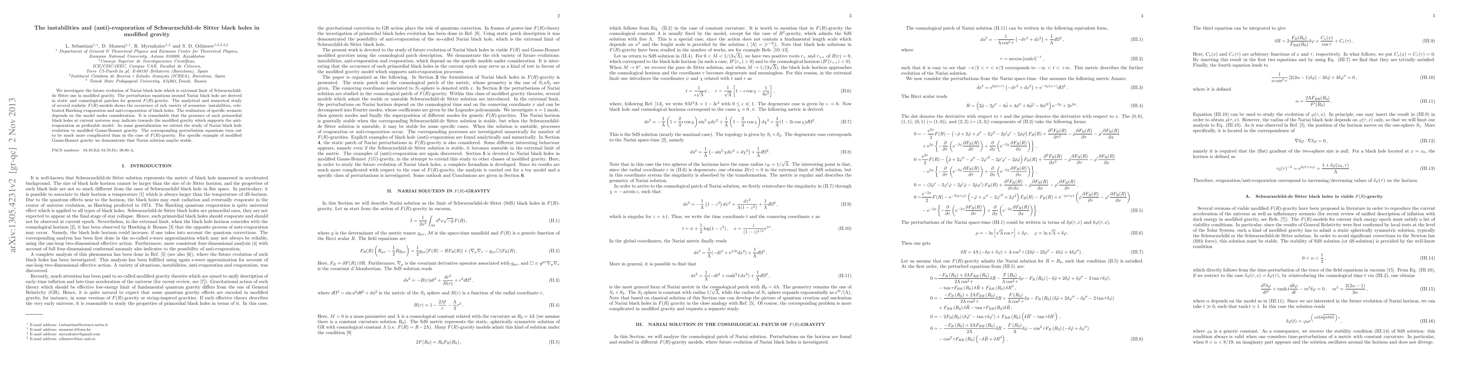 This paper explores the evolution and instabilities of Nariai black holes in modified gravity frameworks, specifically $F(R)$ and Gauss-Bonnet gravity, revealing diverse scenarios including Hawking evaporation and anti-evaporation, with implications for primordial black holes and modified gravity theories.
