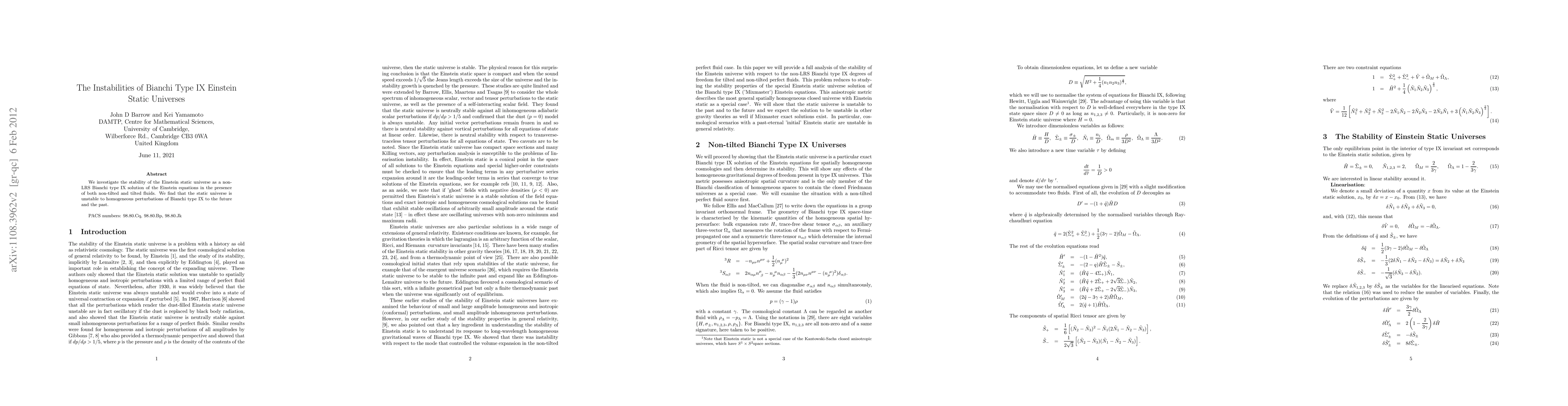 This paper examines the stability of the Einstein static universe as a non-LRS Bianchi type IX solution, revealing it to be unstable to homogeneous perturbations under both non-tilted and tilted fluid conditions. The static universe exhibits instability extending to both future and past perturbations.
