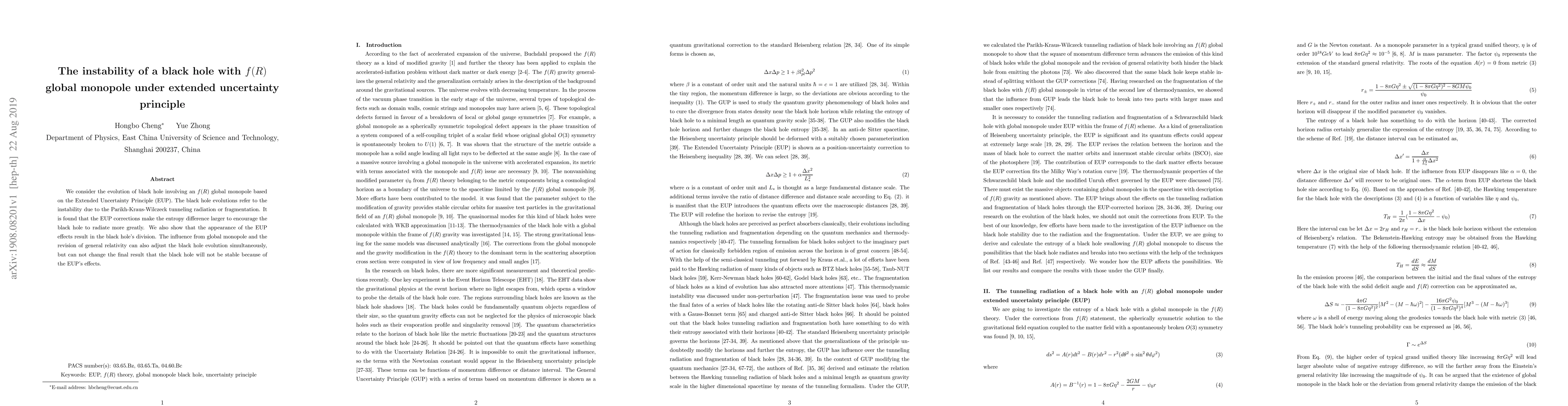 We consider the evolution of black hole involving an $f(R)$ global monopole based on the Extended Uncertainty Principle (EUP). The black hole evolutions refer to the instability due to the Parikh-Kraus-Wilczeck tunneling radiation or fragmentation. It is found that the EUP corrections make the entropy difference larger to encourage the black hole to radiate more greatly. We also show that the appearance of the EUP effects result in the black hole's division. The influence from global monopole and the revision of general relativity can also adjust the black hole evolution simultaneously, but can not change the final result that the black hole will not be stable because of the EUP's effects.