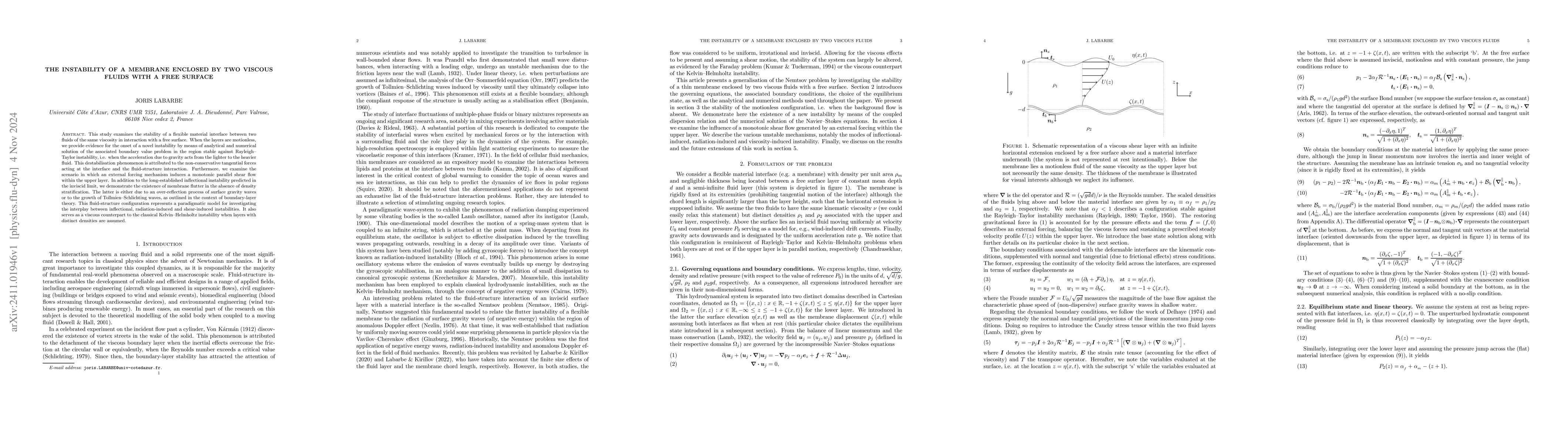 This study examines the stability of a flexible material interface between two fluids of the same viscosity in interaction with a free surface. When the layers are motionless, we provide evidence for the onset of a novel instability by means of analytical and numerical solution of the associated boundary value problem in the region stable against Rayleigh--Taylor instability, i.e. when the acceleration due to gravity acts from the lighter to the heavier fluid. This destabilisation phenomenon is attributed to the non-conservative tangential forces acting at the interface and the fluid-structure interaction. Furthermore, we examine the scenario in which an external forcing mechanism induces a monotonic parallel shear flow within the upper layer. In addition to the long-established inflectional instability predicted in the inviscid limit, we demonstrate the existence of membrane flutter in the absence of density stratification. The latter is either due to an over-reflection process of surface gravity waves or to the growth of Tollmien--Schlichting waves, as outlined in the context of boundary-layer theory. This fluid-structure configuration represents a paradigmatic model for investigating the interplay between inflectional, radiation-induced and shear-induced instabilities. It also serves as a viscous counterpart to the classical Kelvin--Helmholtz instability when layers with distinct densities are assumed.