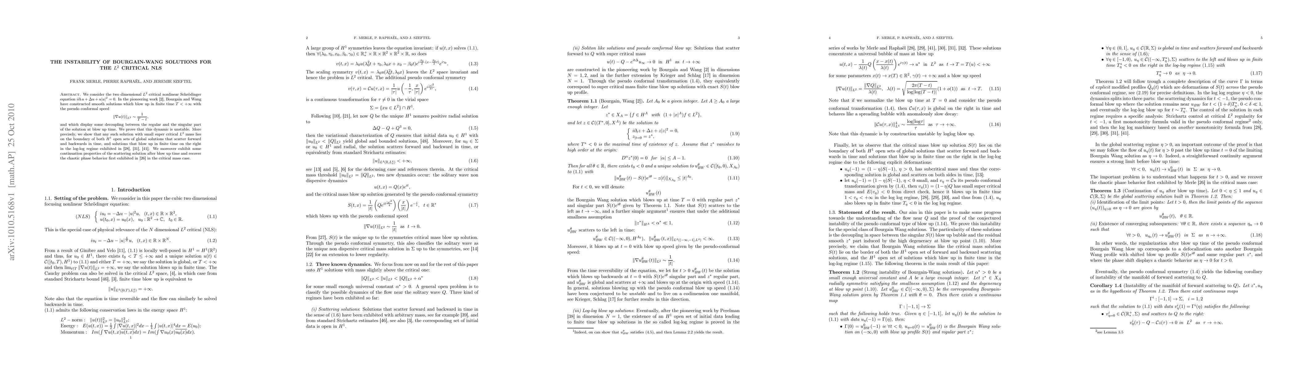 We consider the two dimensional $L^2$ critical nonlinear Schr\"odinger equation $i\pa_tu+\Delta u+u|u|^2=0$. In the pioneering work \cite{BW}, Bourgain and Wang have constructed smooth solutions which blow up in finite time $T<+\infty$ with the pseudo conformal speed $$\|\nabla u(t)\|_{L^2}\sim \frac{1}{T-t},$$ and which display some decoupling between the regular and the singular part of the solution at blow up time. We prove that this dynamic is unstable. More precisely, we show that any such solution with small super critical $L^2$ mass lies on the boundary of both $H^1$ open sets of global solutions that scatter forward and backwards in time, and solutions that blow up in finite time on the right in the log-log regime exhibited in \cite{MR1}, \cite{MR4}, \cite{R1}. We moreover exhibit some continuation properties of the scattering solution after blow up time and recover the chaotic phase behavior first exhibited in \cite{Mcpam} in the critical mass case
