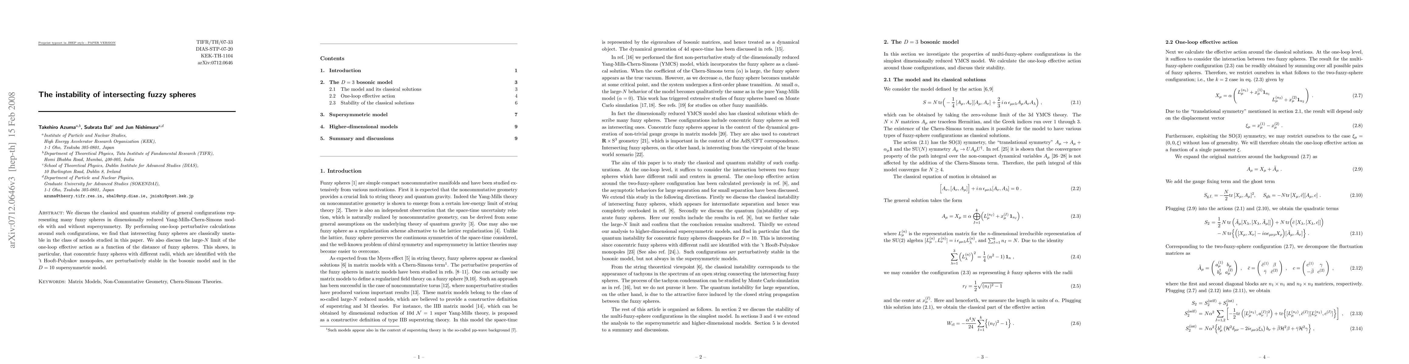 We discuss the classical and quantum stability of general configurations representing many fuzzy spheres in dimensionally reduced Yang-Mills-Chern-Simons models with and without supersymmetry. By performing one-loop perturbative calculations around such configurations, we find that intersecting fuzzy spheres are classically unstable in the class of models studied in this paper. We also discuss the large-N limit of the one-loop effective action as a function of the distance of fuzzy spheres. This shows, in particular, that concentric fuzzy spheres with different radii, which are identified with the 't Hooft-Polyakov monopoles, are perturbatively stable in the bosonic model and in the D=10 supersymmetric model.
