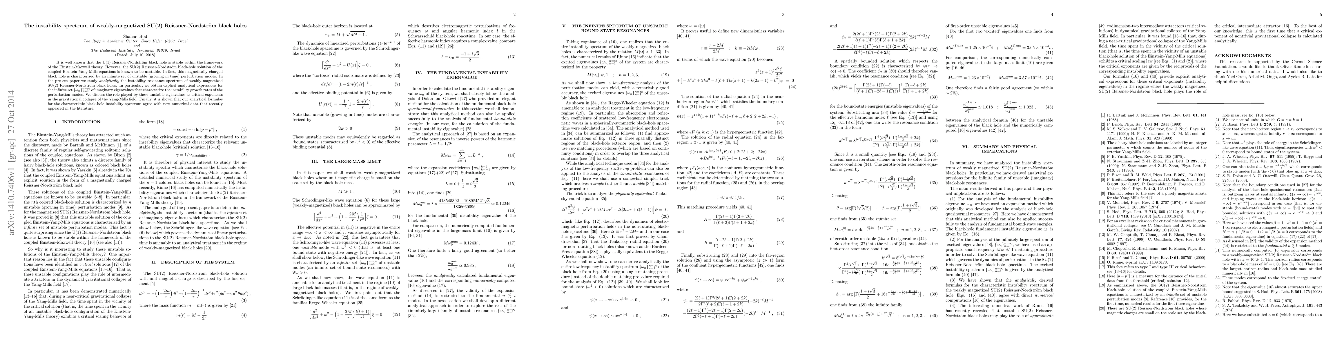 The paper presents explicit analytical expressions for the instability spectrum of weakly-magnetized SU(2) Reissner-Nordström black holes, including the fundamental eigenvalue and an infinite set of excited eigenvalues.