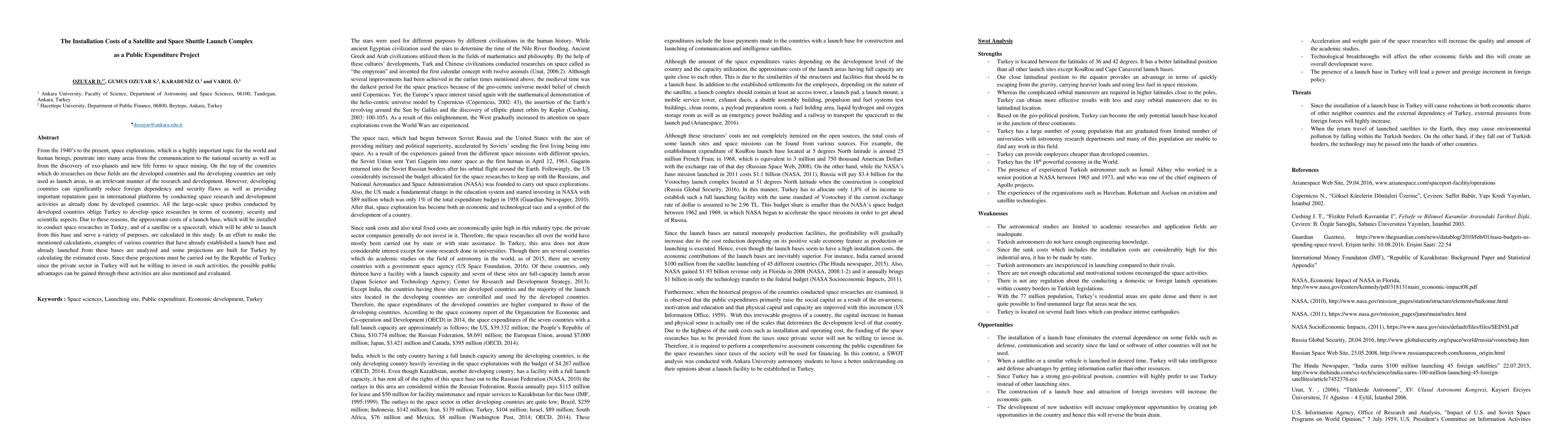 This paper estimates the installation costs for a satellite and space shuttle launch complex in Turkey, analyzing examples from other countries with established launch bases. It discusses the economic, security, and scientific benefits for Turkey, emphasizing the necessity of public investment due to private sector reluctance, and evaluates potential public advantages.