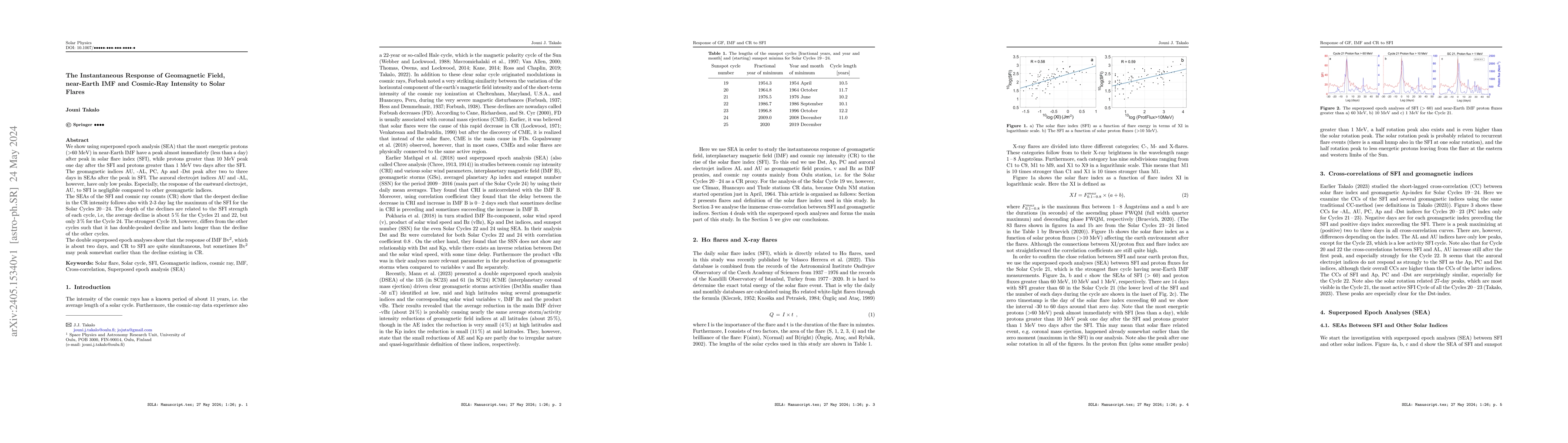 The study reveals that protons in the near-Earth interplanetary magnetic field peak almost immediately after solar flares, with varying time delays for different energy levels. The geomagnetic indices and cosmic ray intensity show significant declines with a 2-3 day lag after solar flares, with deeper declines correlating to stronger solar activity cycles.