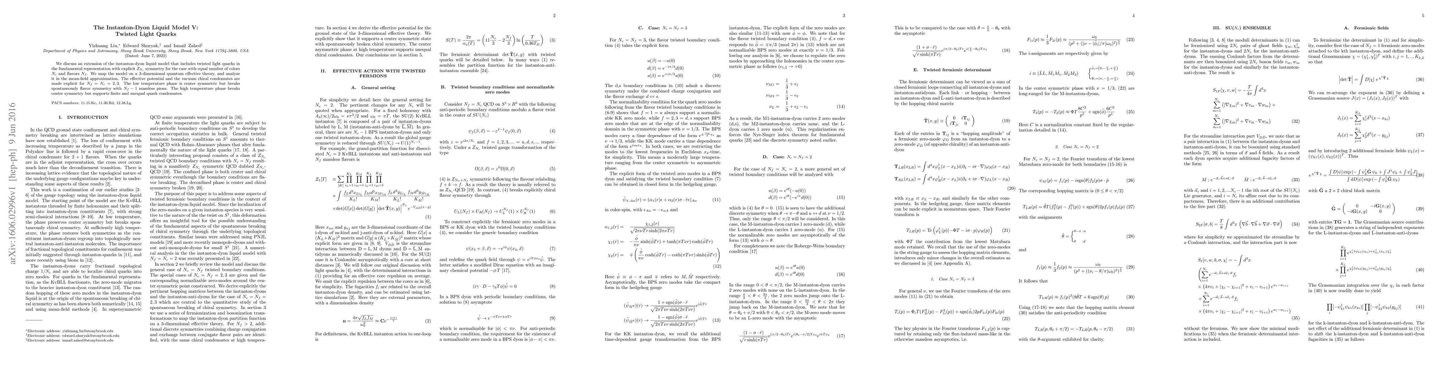 This paper extends the instanton-dyon liquid model to include twisted light quarks with $Z_{N_c}$ symmetry, mapping it to a 3D quantum effective theory. It analyzes the model in mean-field approximation, finding a low-temperature phase with spontaneous flavor symmetry breaking and a high-temperature phase with center symmetry breaking and unequal quark condensates.