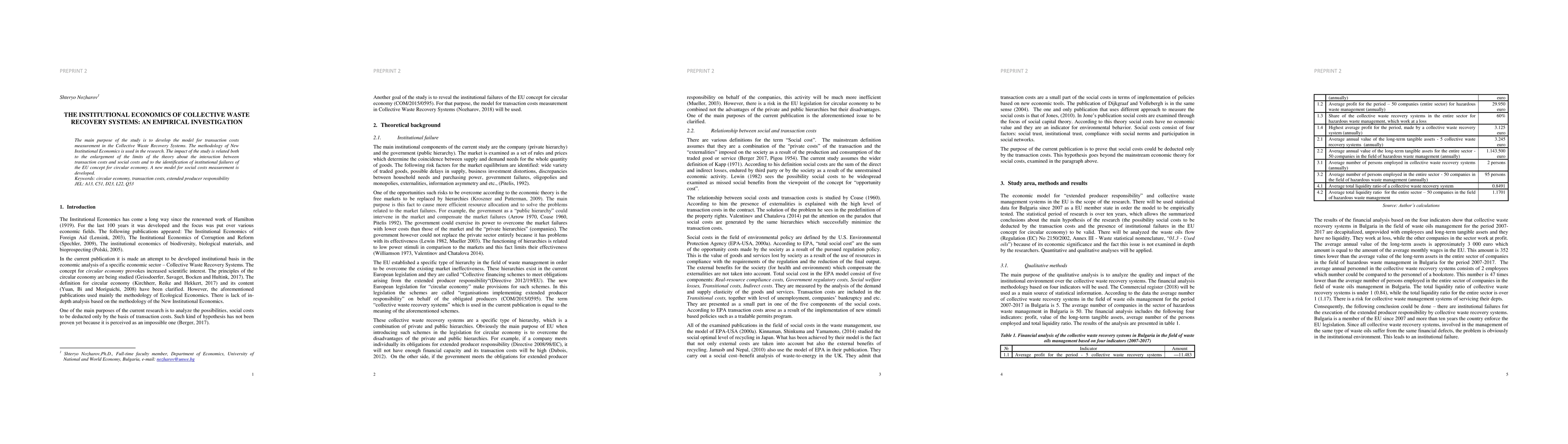 The main purpose of the study is to develop the model for transaction costs measurement in the Collective Waste Recovery Systems. The methodology of New Institutional Economics is used in the research. The impact of the study is related both to the enlargement of the limits of the theory about the interaction between transaction costs and social costs and to the identification of institutional failures of the European concept for circular economy. A new model for social costs measurement is developed. Keywords: circular economy, transaction costs, extended producer responsibility JEL: A13, C51, D23, L22, Q53