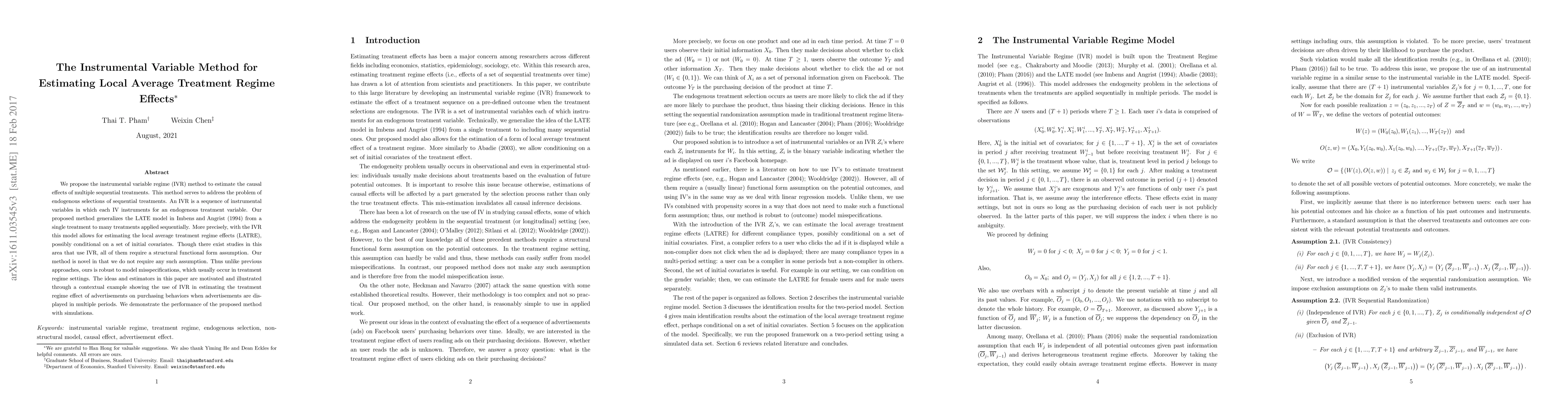 We propose the instrumental variable regime (IVR) method to estimate the causal effects of multiple sequential treatments. This method serves to address the problem of endogenous selections of sequential treatments. An IVR is a sequence of instrumental variables in which each IV instruments for an endogenous treatment variable. Our proposed method generalizes the LATE model in Imbens and Angrist (1994) from a single treatment to many treatments applied sequentially. More precisely, with the IVR this model allows for estimating the local average treatment regime effects (LATRE), possibly conditional on a set of initial covariates. Though there exist studies in this area that use IVR, all of them require a structural functional form assumption. Our method is novel in that we do not require any such assumption. Thus unlike previous approaches, ours is robust to model misspecifications, which usually occur in treatment regime settings. The ideas and estimators in this paper are motivated and illustrated through a contextual example showing the use of IVR in estimating the treatment regime effect of advertisements on purchasing behaviors when advertisements are displayed in multiple periods. We demonstrate the performance of the proposed method with simulations.