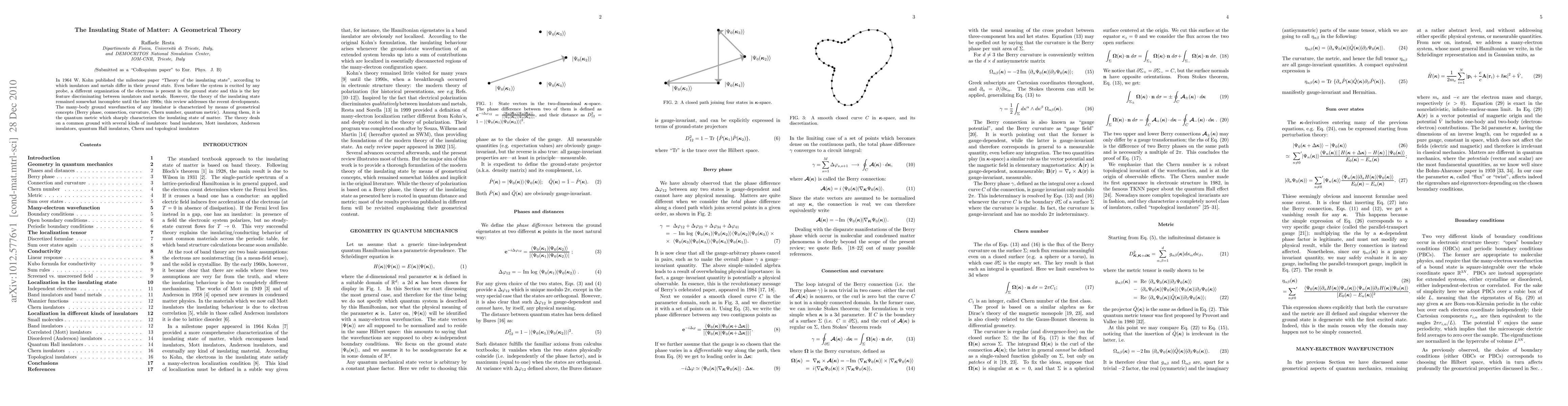 In 1964 W. Kohn published the milestone paper "Theory of the insulating state'", according to which insulators and metals differ in their ground state. Even before the system is excited by any probe, a different organization of the electrons is present in the ground state and this is the key feature discriminating between insulators and metals. However, the theory of the insulating state remained somewhat incomplete until the late 1990s; this review addresses the recent developments. The many-body ground wavefunction of any insulator is characterized by means of geometrical concepts (Berry phase, connection, curvature, Chern number, quantum metric). Among them, it is the quantum metric which sharply characterizes the insulating state of matter. The theory deals on a common ground with several kinds of insulators: band insulators, Mott insulators, Anderson insulators, quantum Hall insulators, Chern and topological insulators