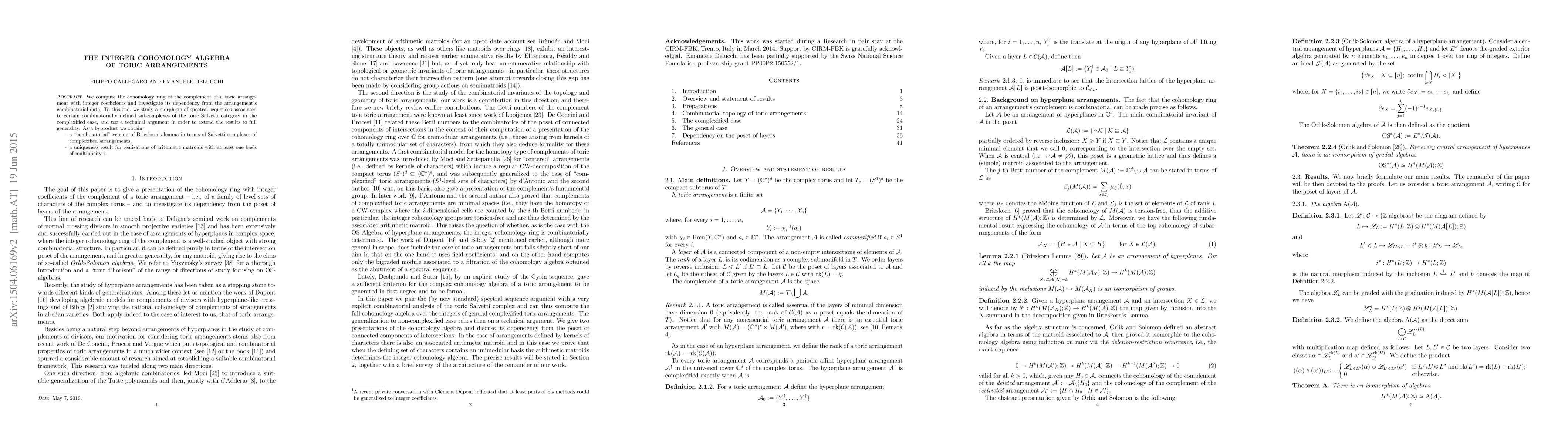 This paper computes the integer cohomology algebra of the complement of a toric arrangement, analyzing its dependency on the arrangement's combinatorial data. It leverages spectral sequences from combinatorial subcomplexes of the Salvetti category to achieve the results, extending them to full generality and obtaining a combinatorial version of Brieskorn's lemma and a uniqueness result for arithmetic matroids.