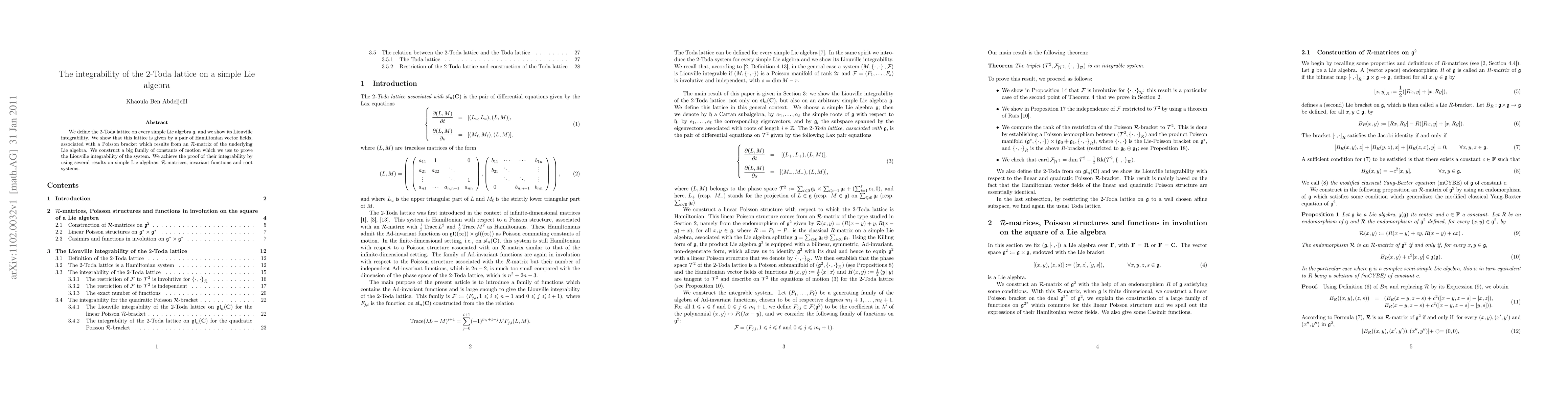 This paper defines the 2-Toda lattice on any simple Lie algebra and demonstrates its Liouville integrability through Hamiltonian vector fields and a Poisson bracket derived from the Lie algebra's R-matrix. The authors construct numerous constants of motion to prove the system's integrability, leveraging results from simple Lie algebras, R-matrices, invariant functions, and root systems.