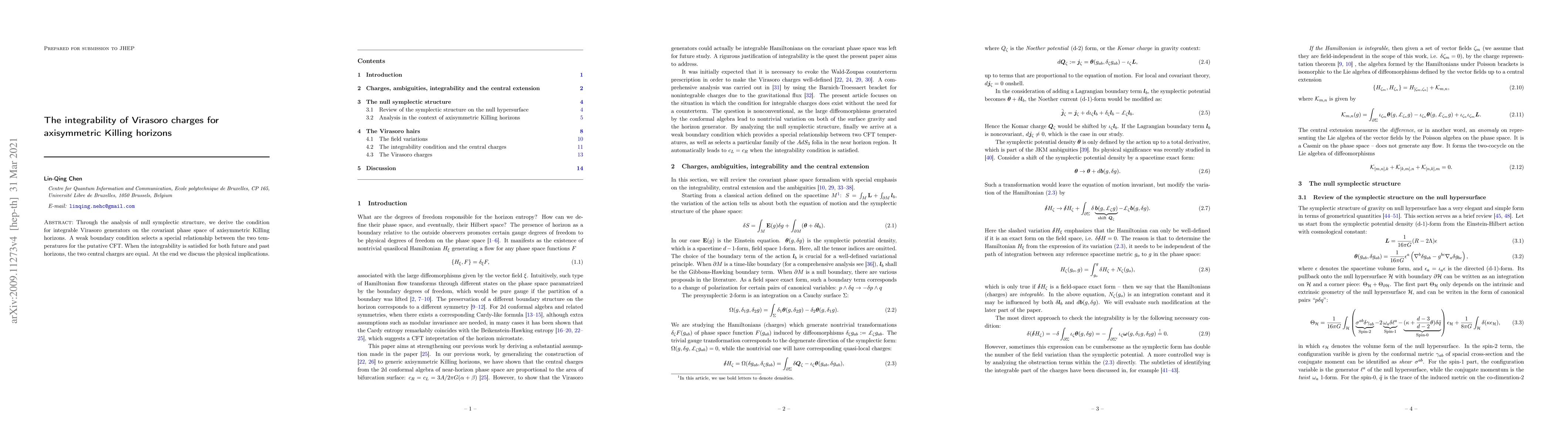 This paper investigates the integrability of Virasoro charges on axisymmetric Killing horizons by analyzing the null symplectic structure, revealing that a weak boundary condition leads to equal central charges for future and past horizons when integrability conditions are met. The study concludes with a discussion on the physical implications of these findings.